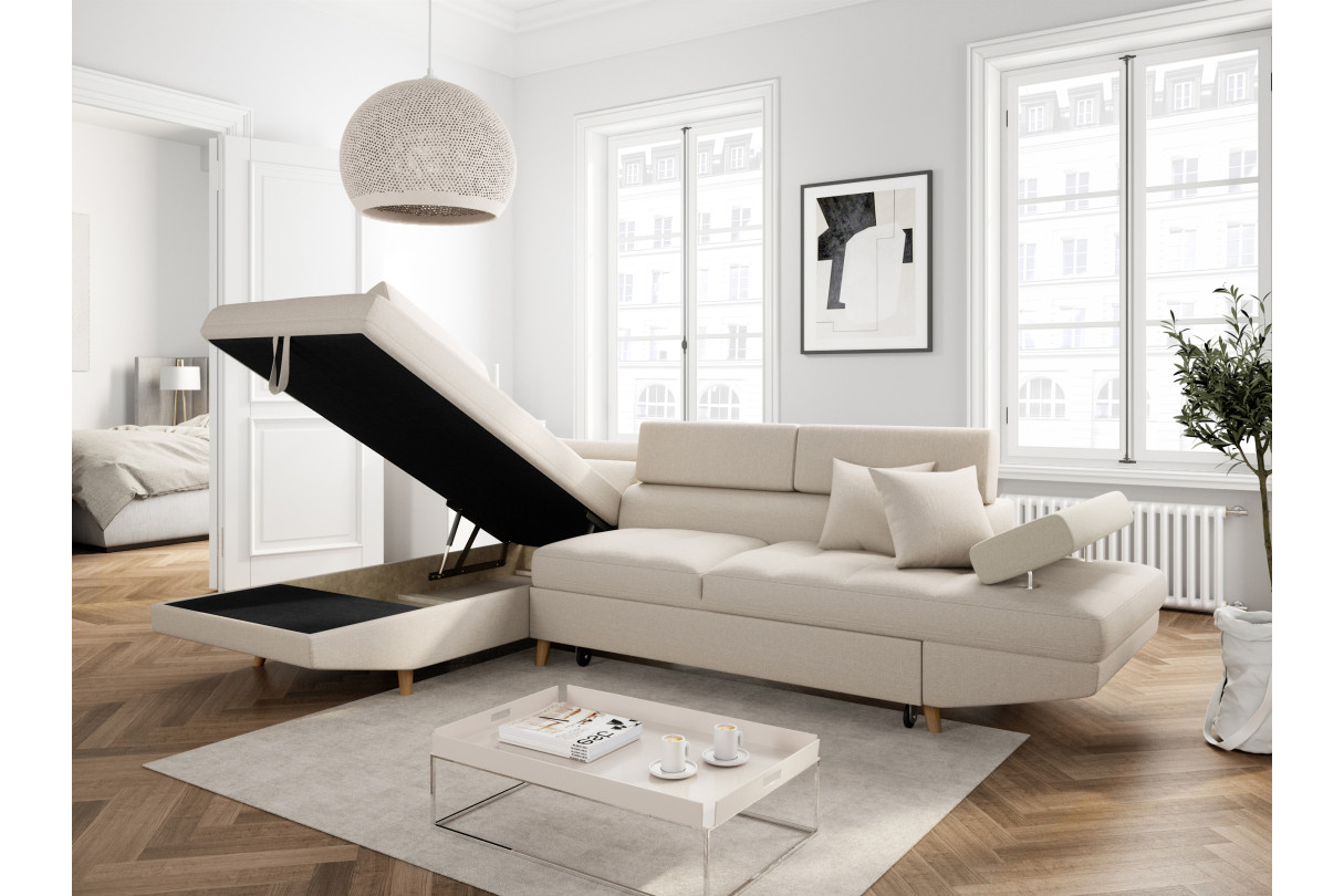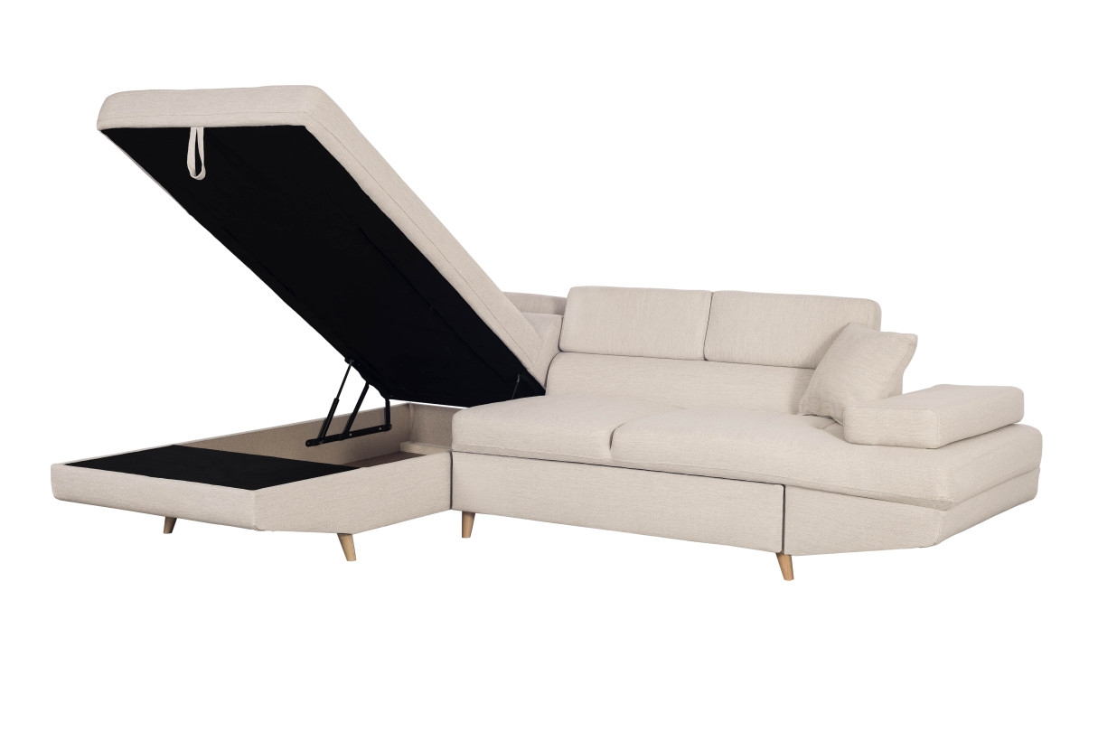 Canapé d'angle gauche convertible RIO Scandinave avec coffre en tissu - Beige, Pieds bois