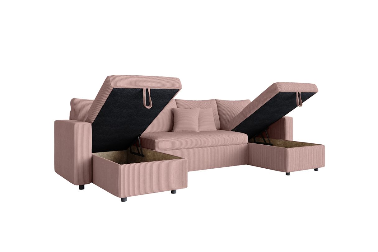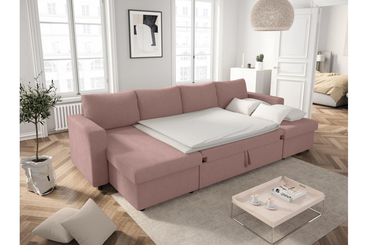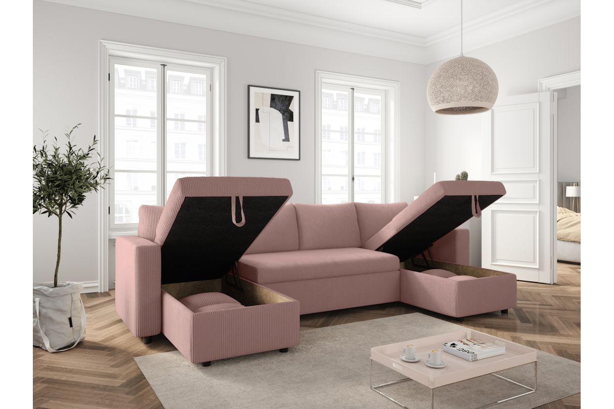 Canapé d'angle panoramique MARIA convertible avec 2 coffres en velours côtelé - Rose