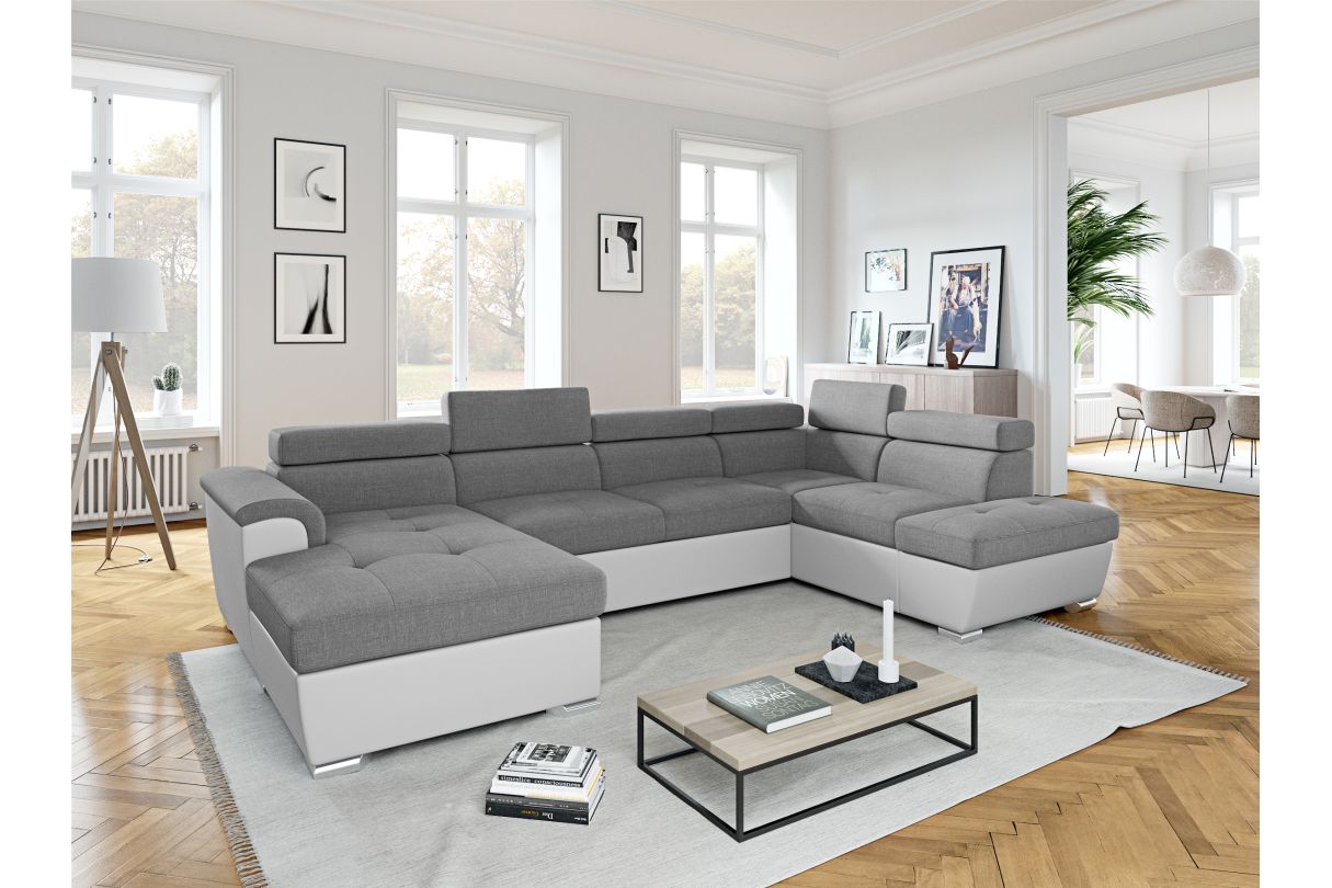 Canapé d'angle Panoramique PAOLA convertible en Simili et Tissu - Blanc et Gris