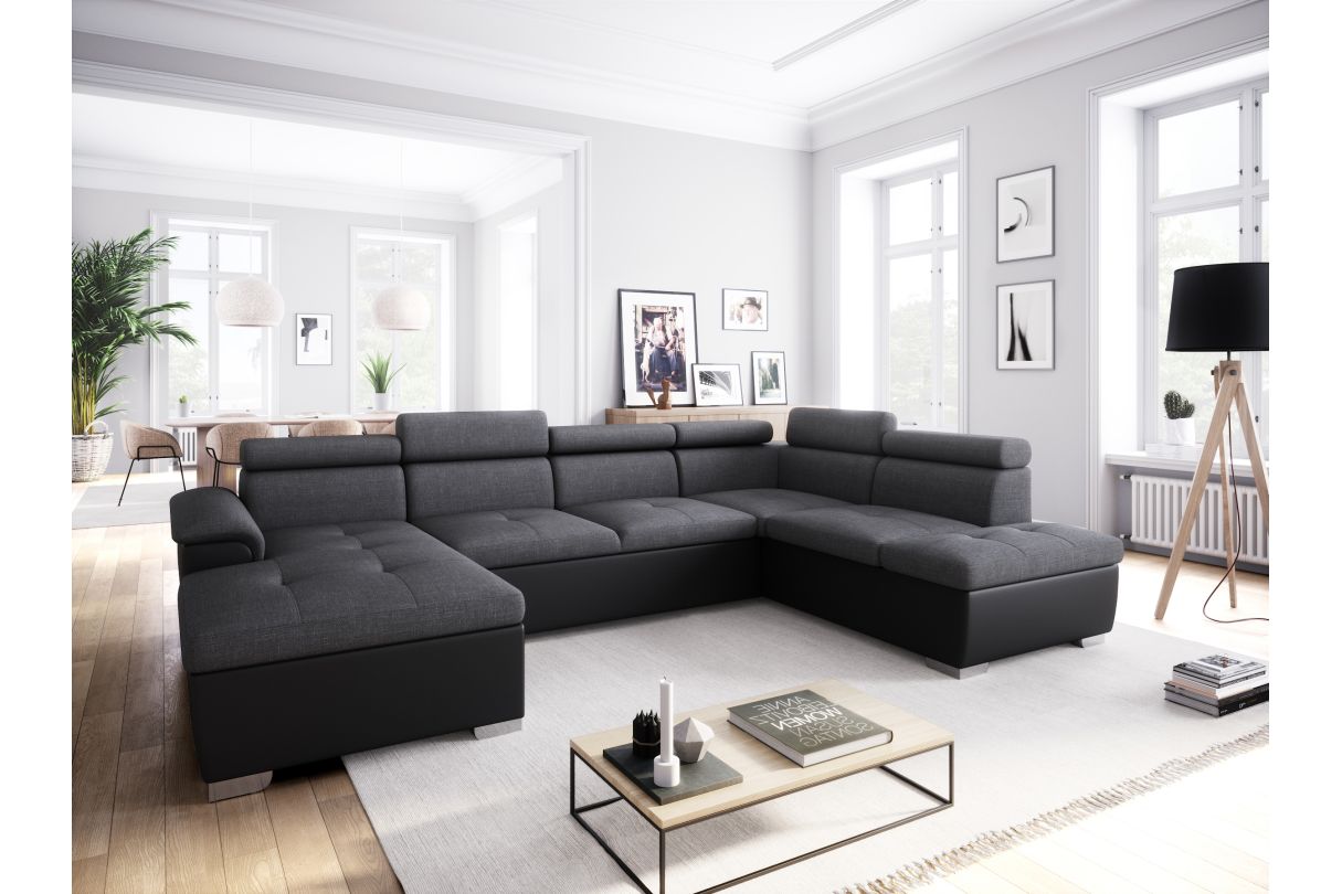 Canapé d'angle Panoramique PAOLA convertible en Simili et Tissu - Gris et Noir