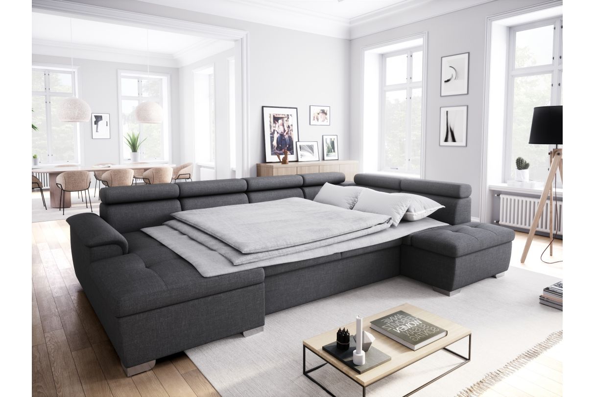 Pour recevoir vos proches, le canapé panoramique PAOLA est doté d'une fonction convertible. Il vous suffit d'ouvrir le tiroir situé sous l'assise pour le transformer en un couchage d'appoint confortable et pratique.