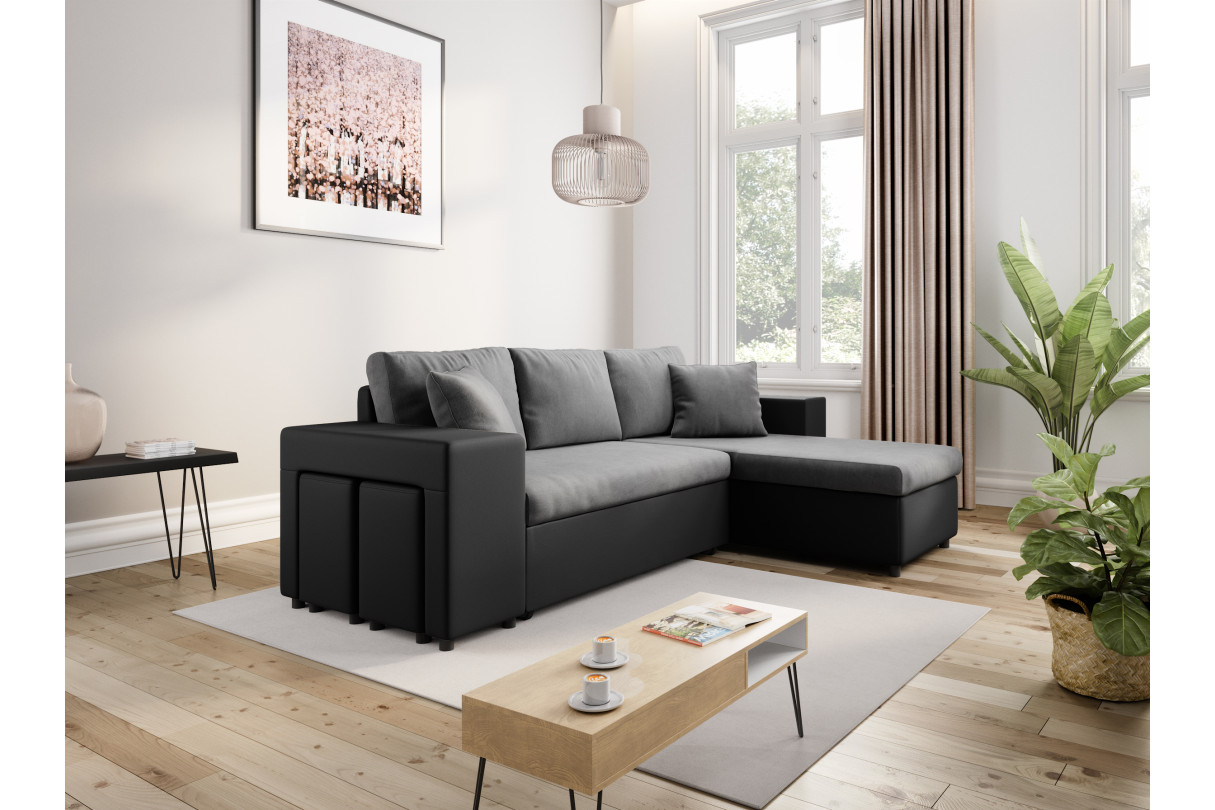 Canapé d'angle réversible MADY avec coffre, accoudoir étagère et poufs gauche en bi-matière