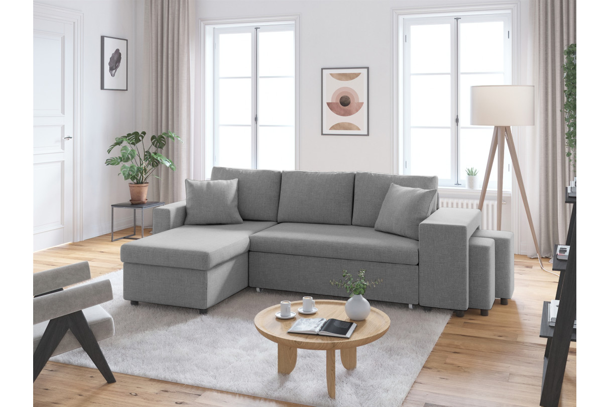 Canapé d'angle réversible OSLO avec coffre et poufs droit - Tissu gris clair