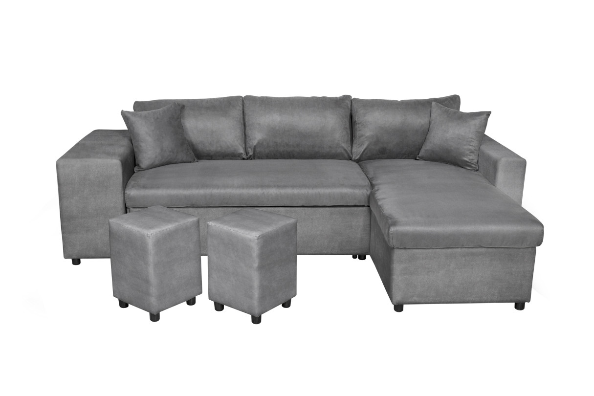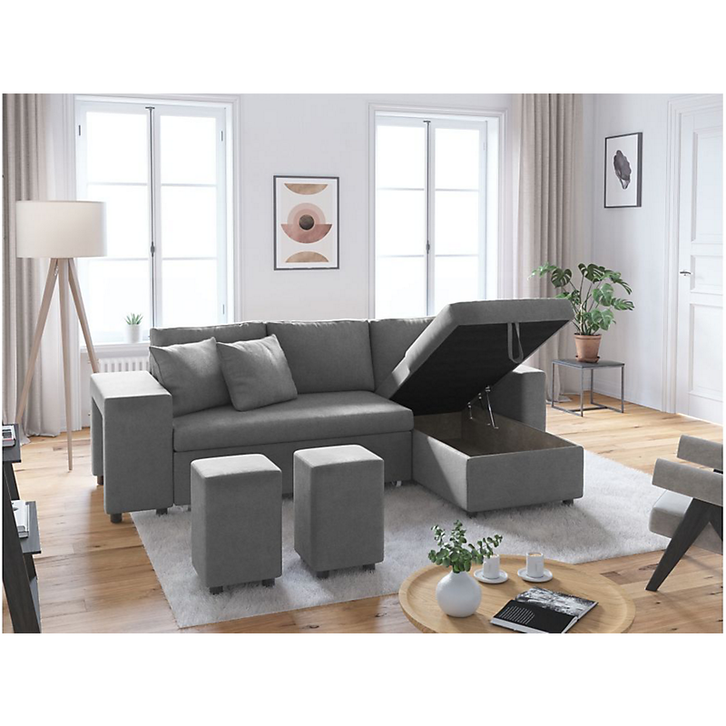 Canapé d'angle réversible OSLO avec coffre et poufs gauche en bi-matière