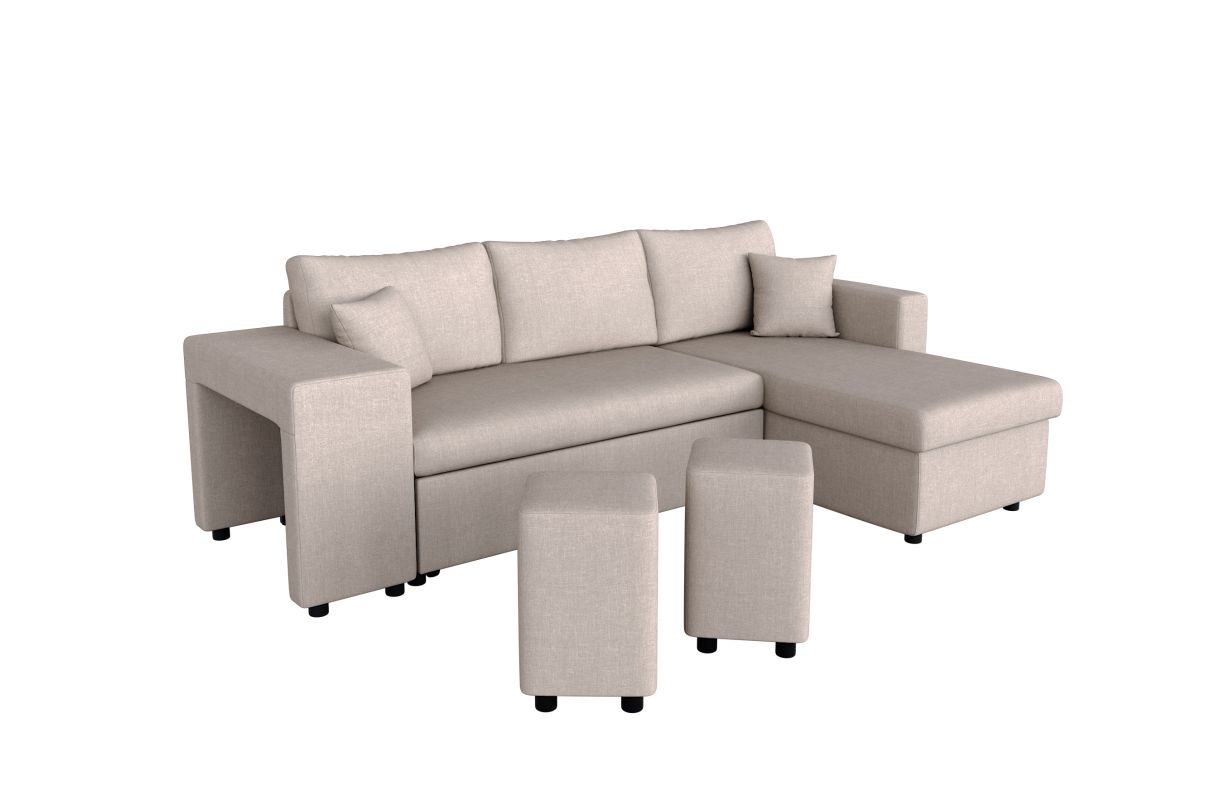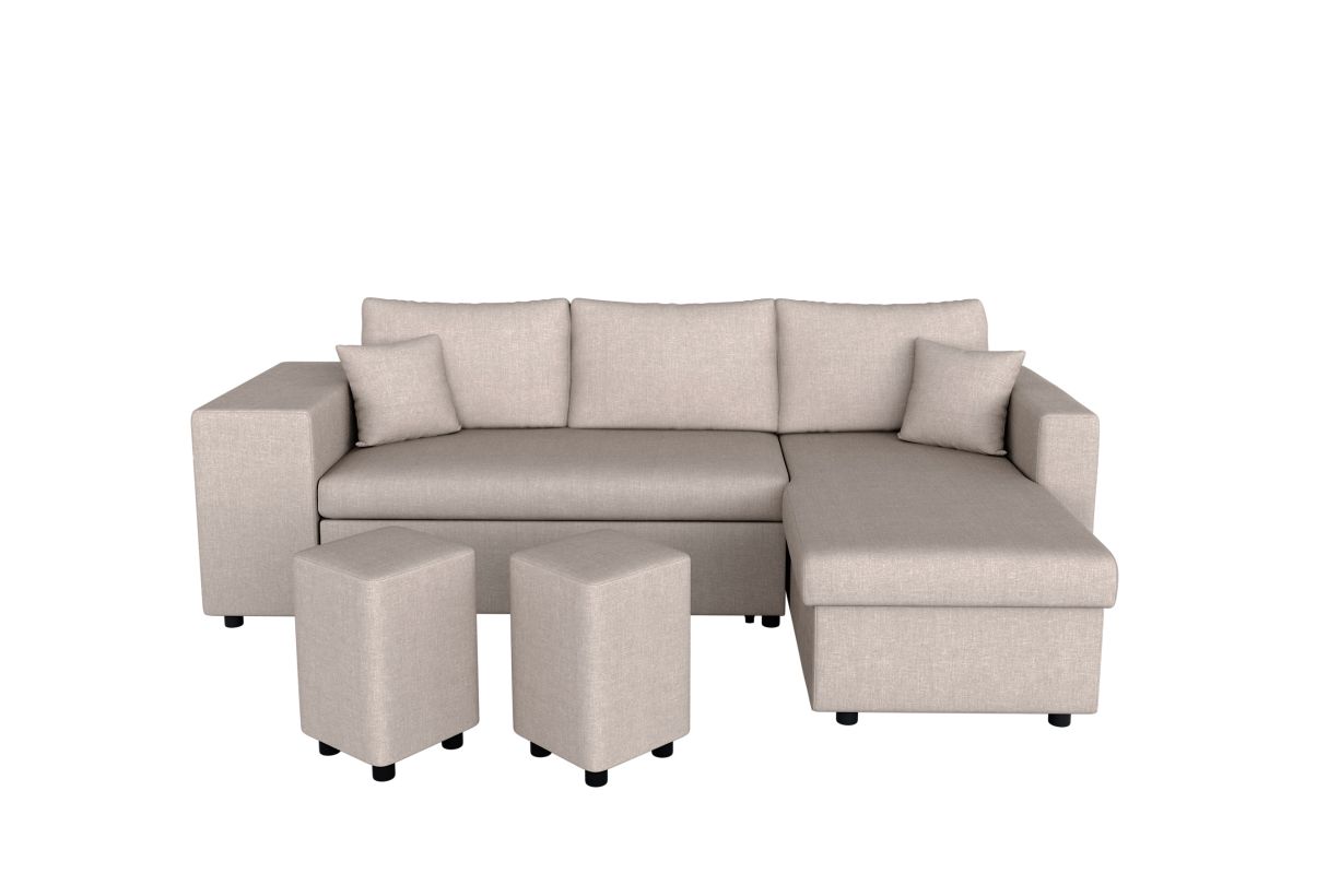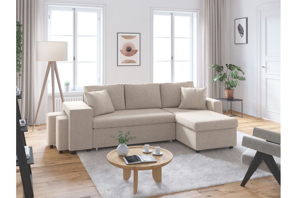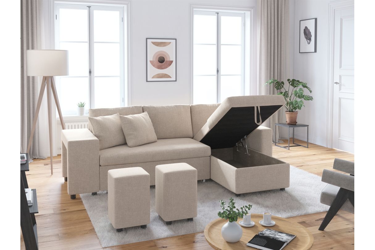 Canapé d'angle réversible OSLO avec coffre et poufs gauche en tissu beige