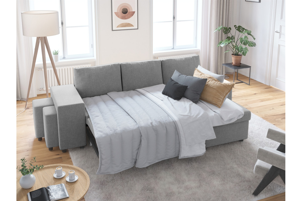 Ce canapé moderne 3 places en tissu a été pensé pour vous offrir gain de place et praticité. Gain de place grâce à son grand coffre de rangement dissimulé sous la méridienne pour un salon toujours bien rangé. Et le côté pratique grâce à ses poufs stockés sous la méridienne pour que vous soyez toujours opérationnels quand vos amis arrivent à l'improviste. Le canapé d'angle OSLO est également convertible en lit.
