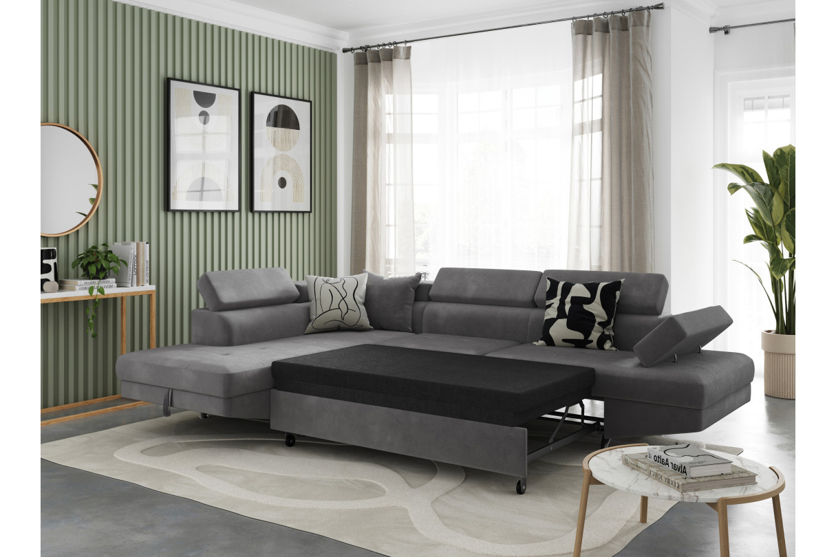 RIO est un grand canapé d'angle convertible au style résolument contemporain, qui fera le bonheur de toute la famille. Grâce à son accoudoir réglable et à ses trois appui-têtes ajustables, le canapé offre un confort modulable, où chacun pourra trouver une position idéale en fonction de sa morphologie. Deux coussins assortis sont également fournis avec ce canapé d'angle convertible. Les pieds en métal apportent une touche de modernité tout en assurant une bonne stabilité au modèle.