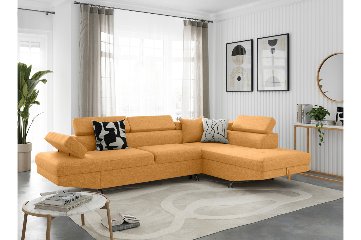 | Libellé | Canapé d'angle RIO convertible avec coffre en tissu - Angle Droit, Jaune ocre |
