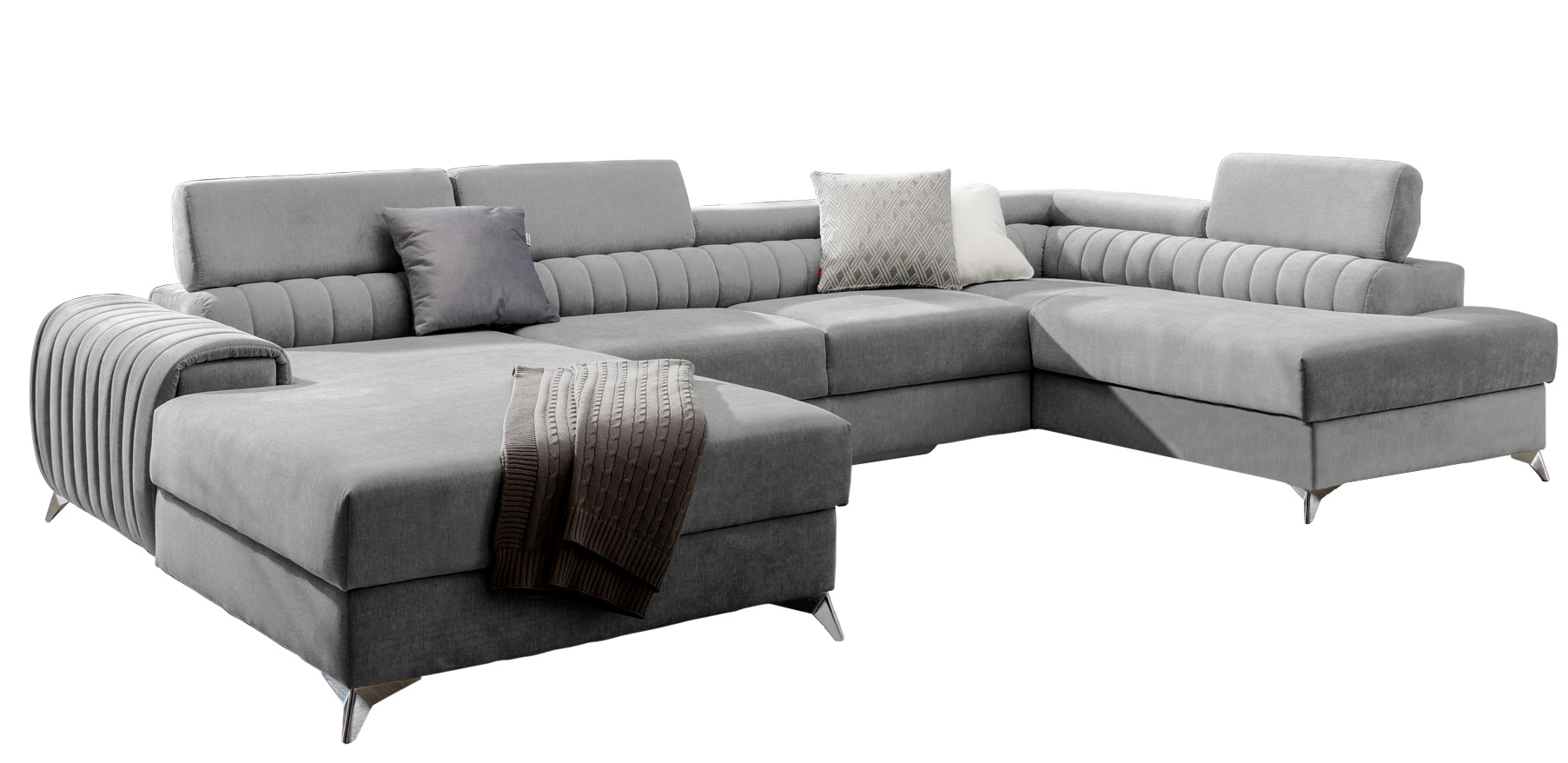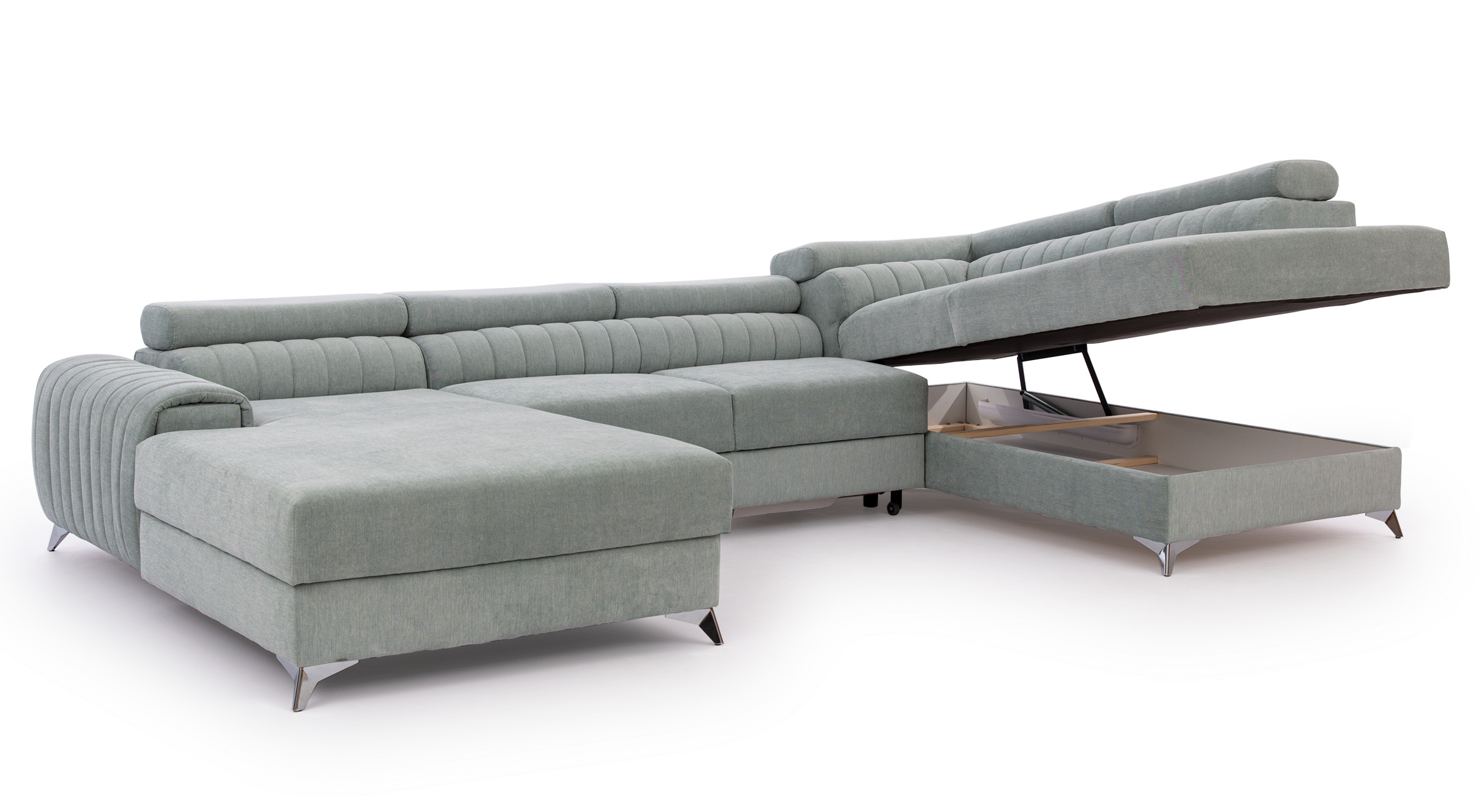 Canapé d'angle U tissu gris clair coffre de rangement à droite Kalante 347cm