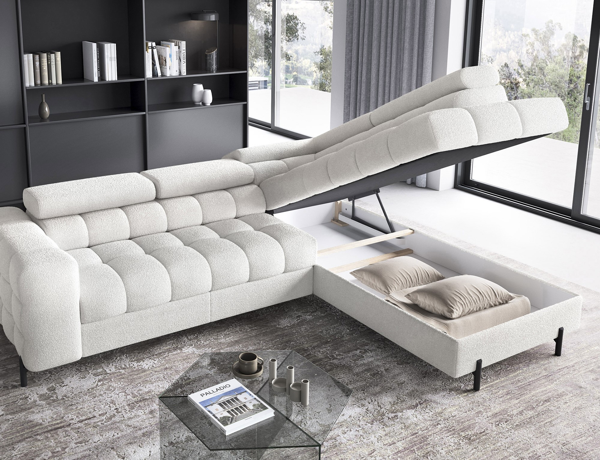 | Libellé | Canapé d’angle velours capitonné Luccino – Convertible et coffre-Couleur Blanc-angle droit |