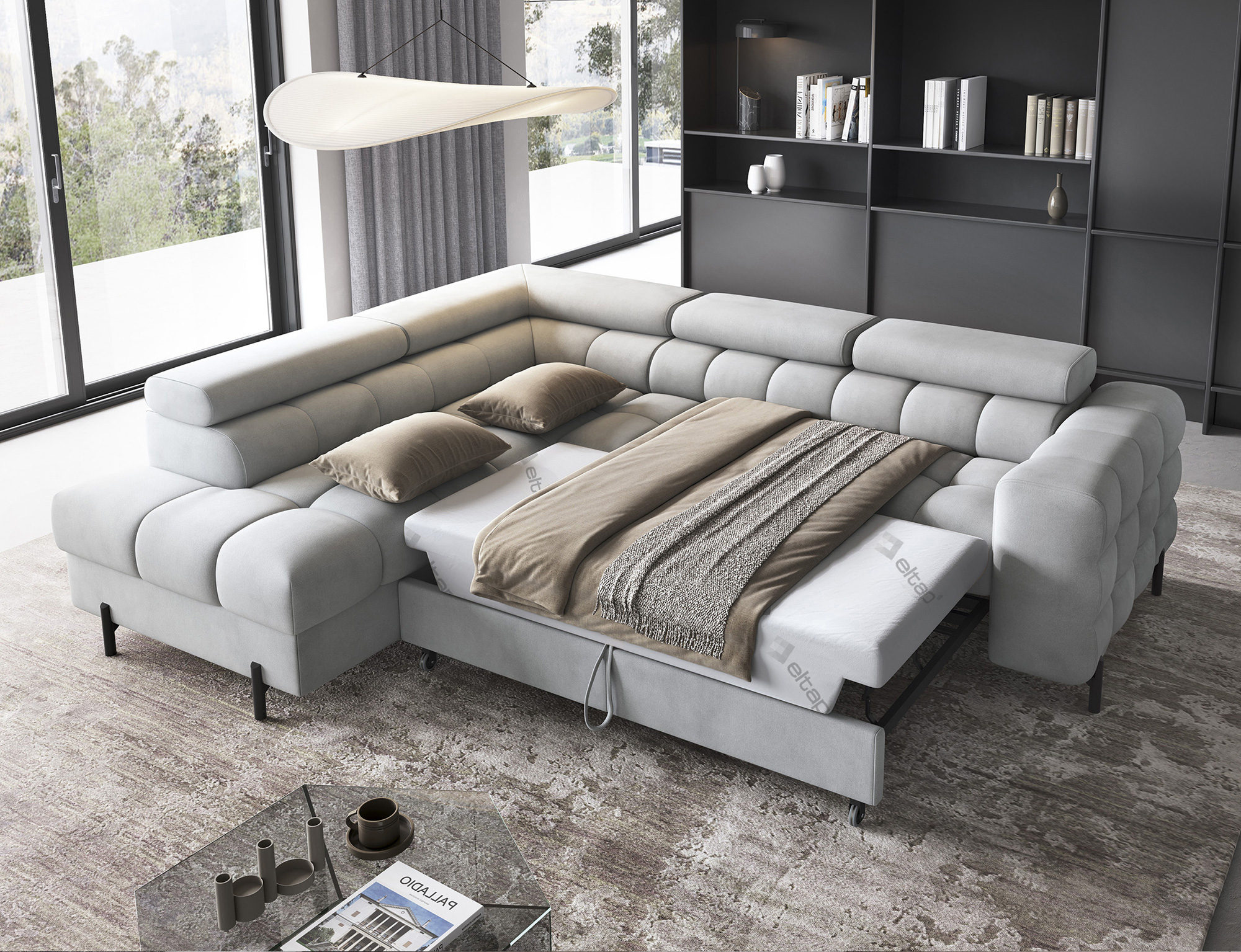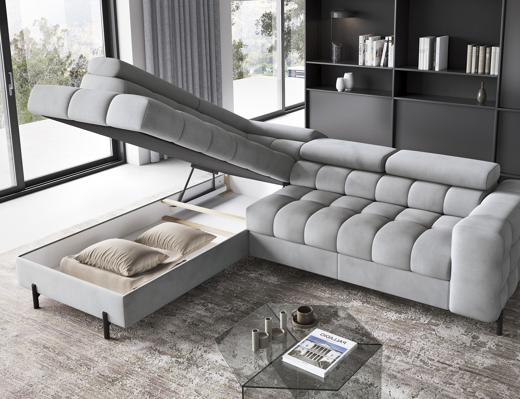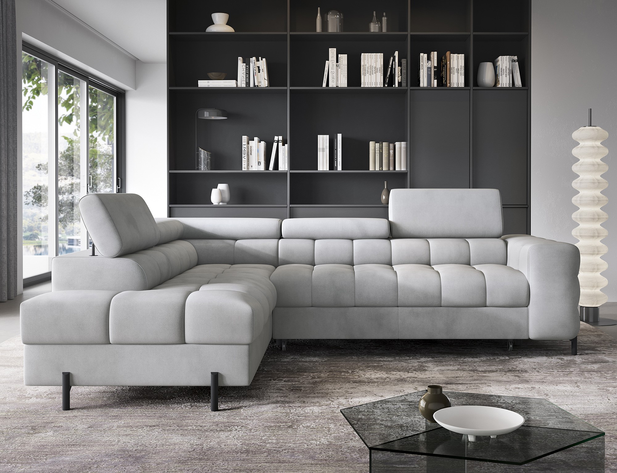 | Libellé | Canapé d’angle velours capitonné Luccino – Convertible et coffre-Couleur Gris clair-angle gauche |
