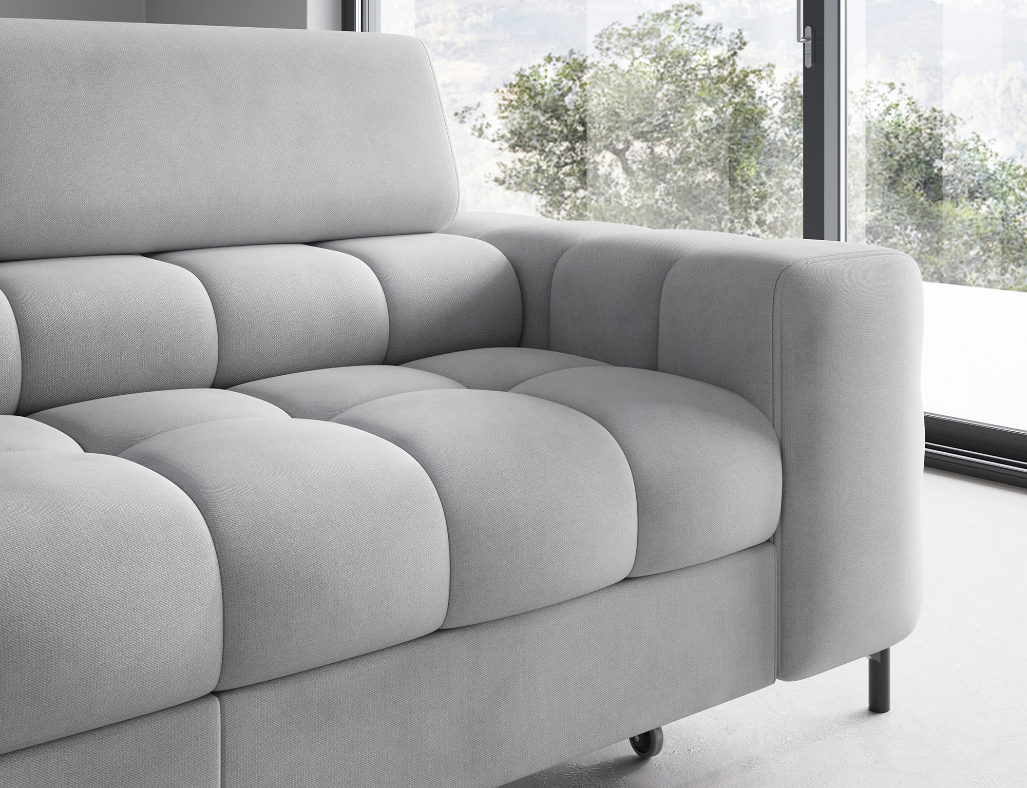 Offrez à votre intérieur une touche de raffinement et de modernité avec le canapé d’angle Luccino, un modèle d’exception conçu pour allier esthétisme, fonctionnalité et confort absolu. Ses dimensions généreuses de 276 x 200 x 72-93 cm et son design épuré en font un choix parfait pour les amateurs de mobilier élégant et sophistiqué. Doté de têtières réglables, le Luccino permet un ajustement personnalisé du dossier, garantissant un maintien optimal et un confort sur mesure. Que ce soit pour des moments de détente en famille ou pour accueillir des invités, ce canapé offre un espace spacieux et accueillant qui s’adapte à tous vos besoins. Disponible en plusieurs coloris et finitions, il se décline en angle droit ou gauche selon votre configuration intérieure. Un mariage parfait entre design et praticité Le Luccino ne se contente pas d’être beau, il est aussi ultra-fonctionnel. Grâce à son mécanisme convertible Dolphin, il se transforme rapidement en un couchage spacieux de 123 x 195 cm, idéal pour un sommeil réparateur. Son coffre de rangement intégré, discret et spacieux (180 x 92 x 17 cm), est parfait pour stocker couettes, oreillers et autres essentiels, optimisant ainsi votre espace de vie. Son revêtement en velours haut de gamme, doux au toucher et résistant, assure une durabilité exceptionnelle tout en sublimant l’élégance du canapé. Traitement hydrofuge et anti-taches, lavable à 30 degrés Caractéristiques techniques Dimensions : L 276 x P 200 x H 72-93 cm Assise : Profondeur 53 cm | Hauteur 44 cm | Capacité d’accueil : 5 personnes Confort : Mousse HR3030 + T3030 pour un maintien moelleux et ergonomique Dossier : Rembourrage en mousse T2130 pour un soutien optimal du dos Têtières ajustables : Oui, Hauteur 72/93 cm pour un confort sur mesure Couchage : Fonction convertible avec surface de 123 x 195 cm Mécanisme : Dolphin, pour une ouverture rapide et sans effort Rangement : Grand coffre intégré (180 x 92 x 17 cm) Pieds : Métalliques noirs, hauteur 9 cm, finition élégante Structure : Bois massif de pin, garantissant robustesse et longévité Accoudoirs : Design carré et moderne Coussins inclus : Oui, rembourrés en mousse granulaire et amovibles Un canapé disponible selon vos envies Le Luccino est proposé en plusieurs teintes élégantes pour s’adapter à votre décoration intérieure. Vous avez également la possibilité de choisir l’angle droit ou gauche, selon l’agencement de votre salon. Informations logistiques Nombre de colis : 2 Poids total : 150 kg Dimensions des colis : Colis 1 : 208 x 103 x 67 cm – 77 kg Colis 2 : 178 x 103 x 67 cm – 73 kg Garantie : 10 ans Fabrication européenne Assemblage requis : Montage partiel à réaliser à deux Pourquoi choisir le canapé d’angle Luccino ? Design moderne et sophistiqué, idéal pour un intérieur élégant Assise spacieuse et ultra-confortable, parfaite pour la détente Fonction convertible avec un couchage généreux et pratique Têtières réglables pour un confort personnalisé Coffre de rangement discret et fonctionnel pour optimiser l’espace Structure robuste et durable, assurant une longévité exceptionnelle Grâce à son design contemporain, son confort premium et ses fonctionnalités bien pensées, le Luccino est le choix idéal pour un salon raffiné, accueillant et moderne. Option(s) sélectionnée(s) : - Couleur : Gris clair - Angle : angle gauche