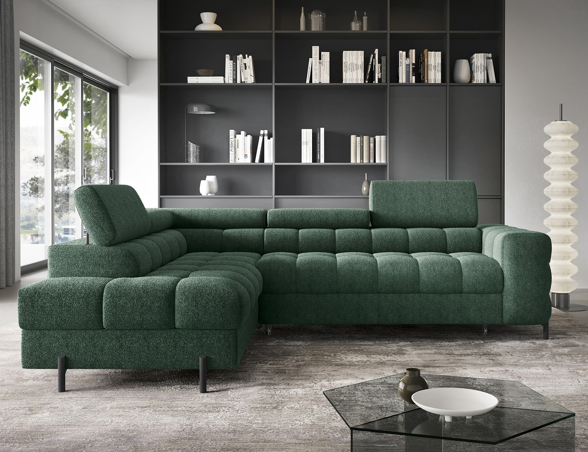 | Libellé | Canapé d’angle velours capitonné Luccino – Convertible et coffre-Couleur Vert-angle gauche |