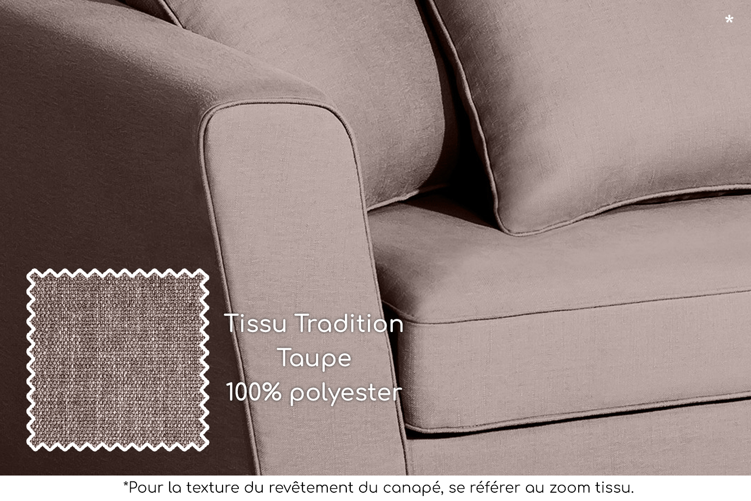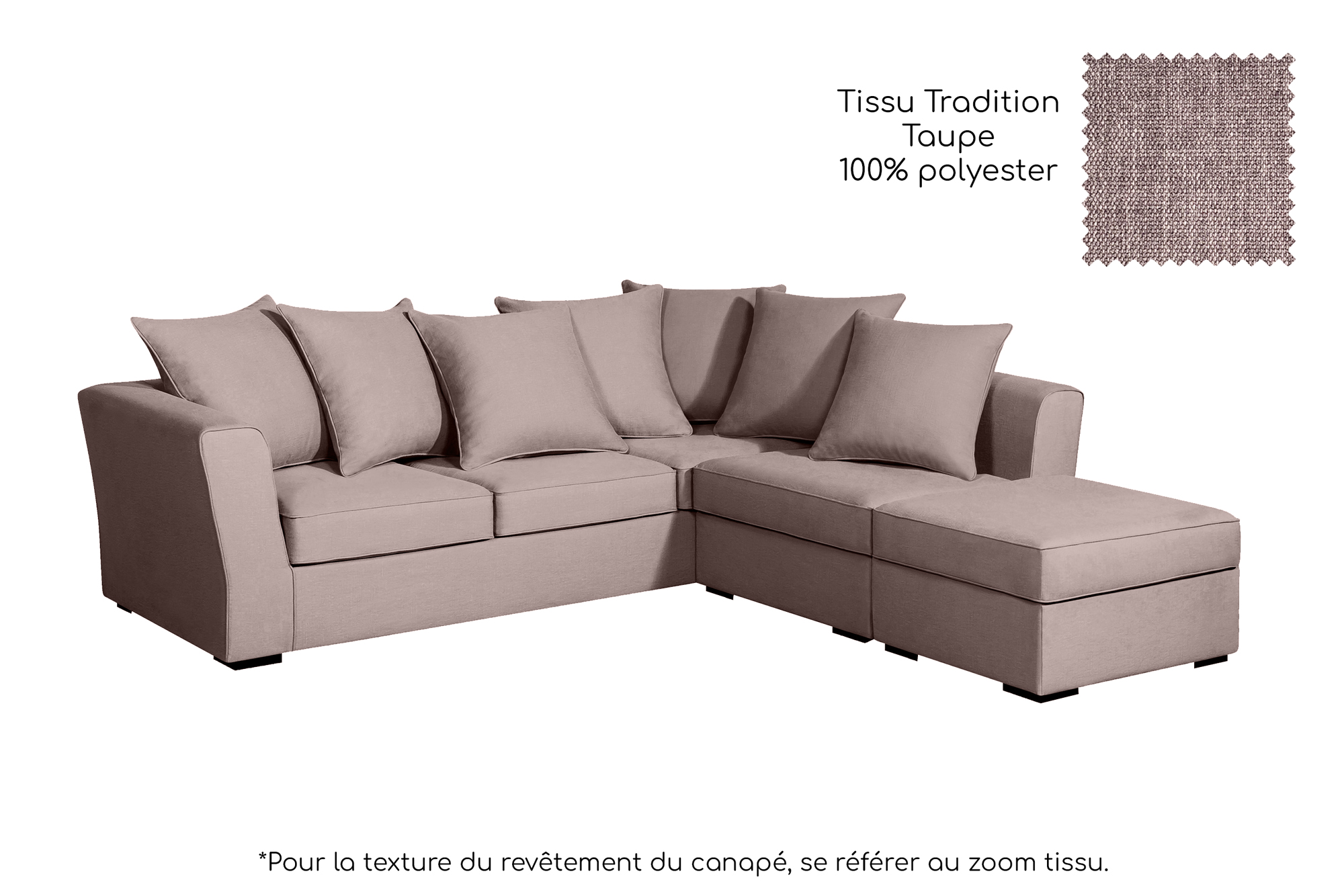 Canapé d'angle YSER 240 x 236 cm fixe tissu Tradition coloris Taupe ◌ Fabriqué en France (Nord, 59) ◌ 100% déhoussable pour un entretien facilité ◌ Tissu 100% polyester très résistant ◌ Angle modulable et réversible, composé de : canapé 5 pl 240 cm + chauffeuse 84x80 cm + pouf 73x65 cm ◌ Garantie 2 ans Descriptif : - Structure : bois, panneaux de fibres et panneaux de particules. Structure recouverte d'une housse en foamé blanc agrafée. - Coussins de dos : remplissage flocons mousse calibrés. - Assises : mousse optimum HR 35 kg/m3 + HR 25 kg/m3. - Pieds : bois wengé.
