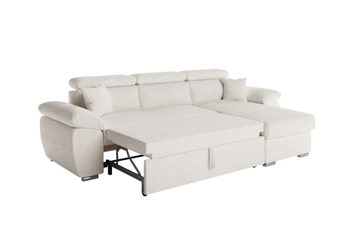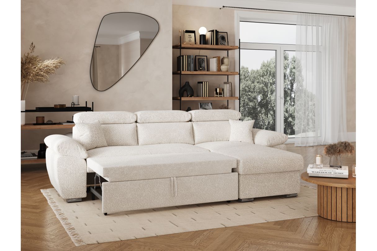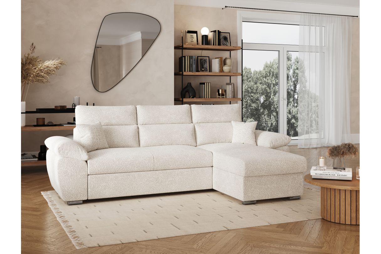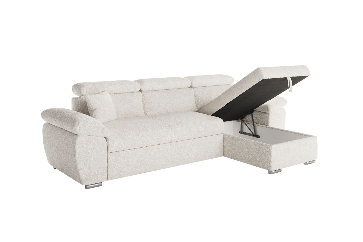 Canapé KOMECO d'angle réversible convertible avec coffre et têtières en tissu bouclette blanc