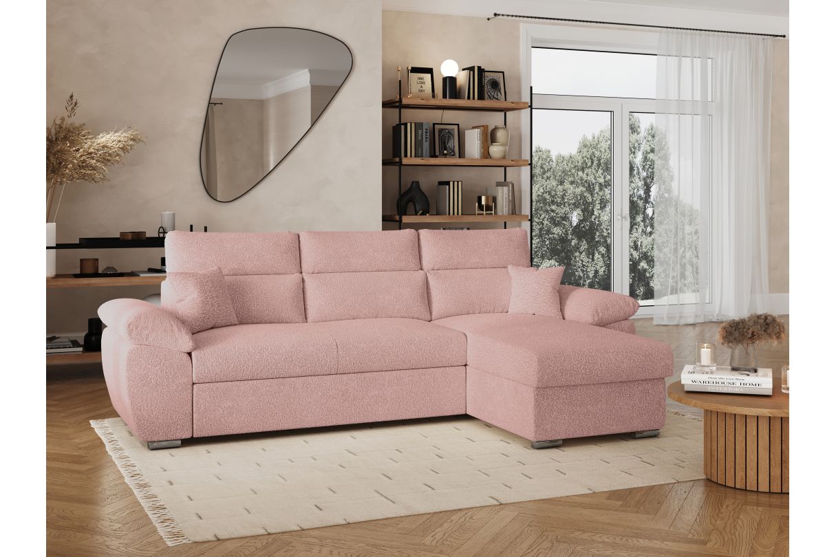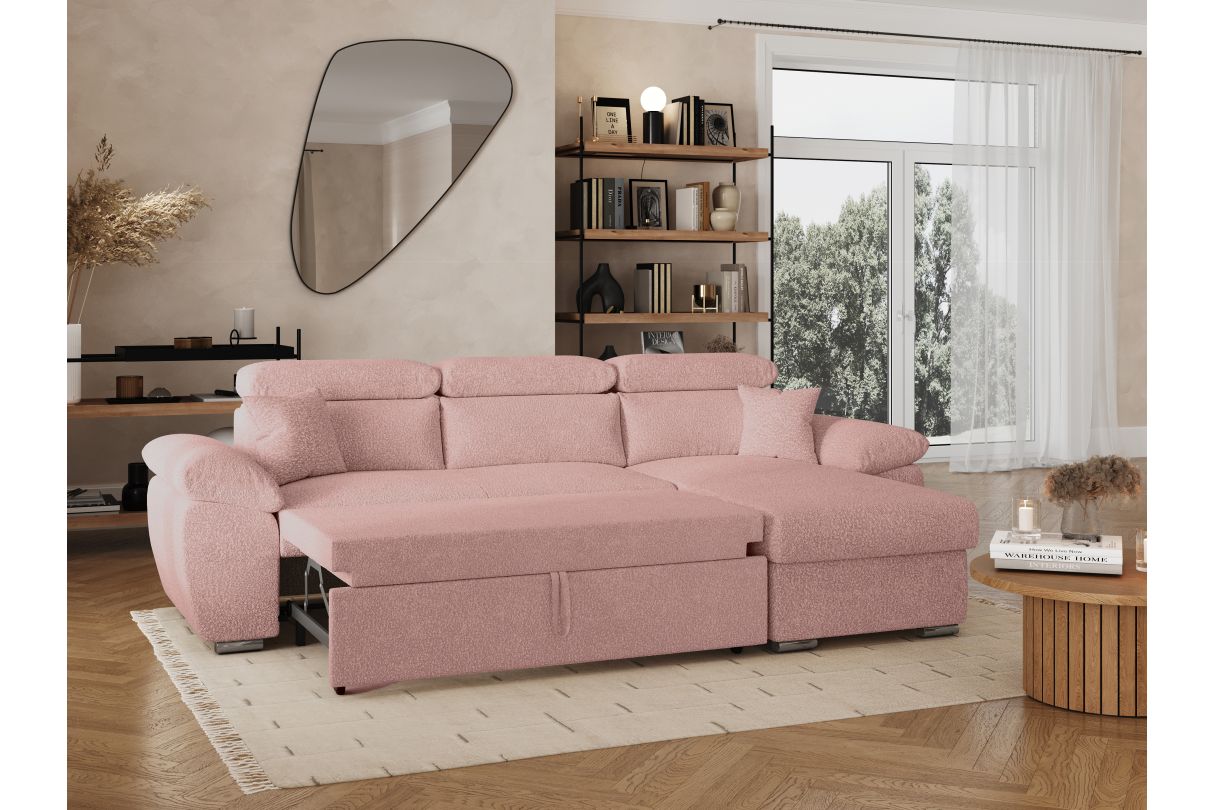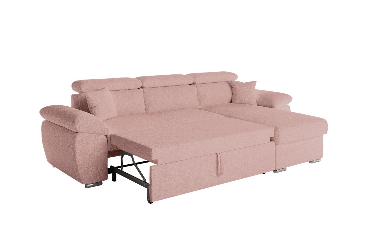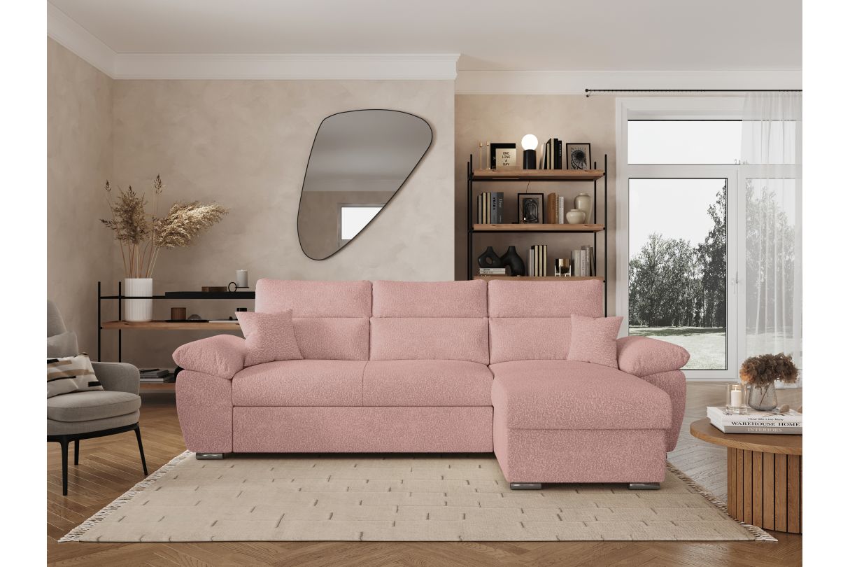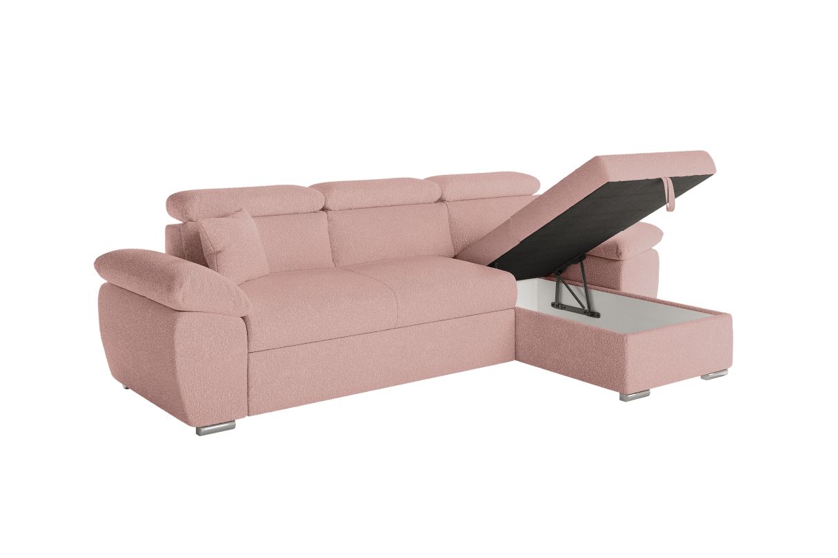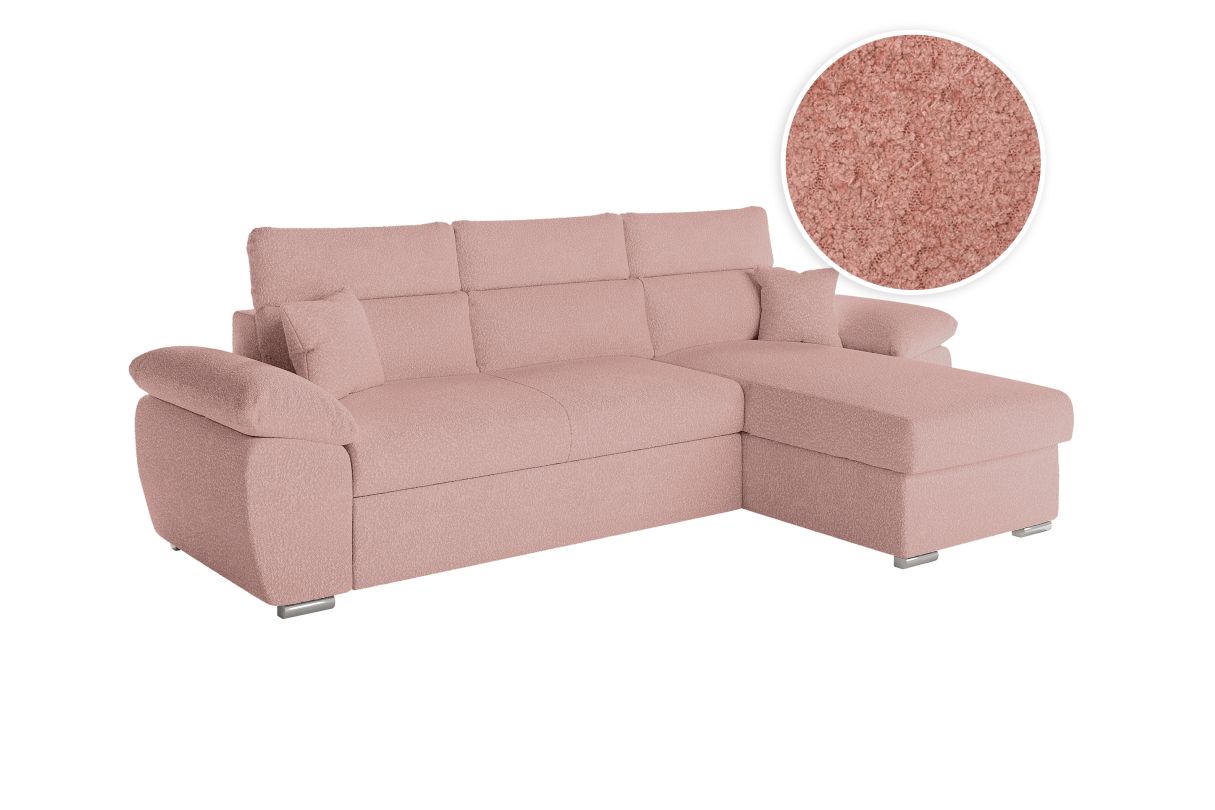 Canapé KOMECO d'angle réversible convertible avec coffre et têtières en tissu bouclette rose