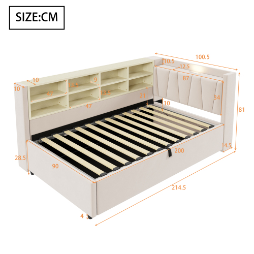 | Libellé | Canapé-lit rembourré , avec espace de rangement hydraulique, avec veilleuse, port de charge USB et Type-C, avec étagères de rangement,90 x 200 cm |
