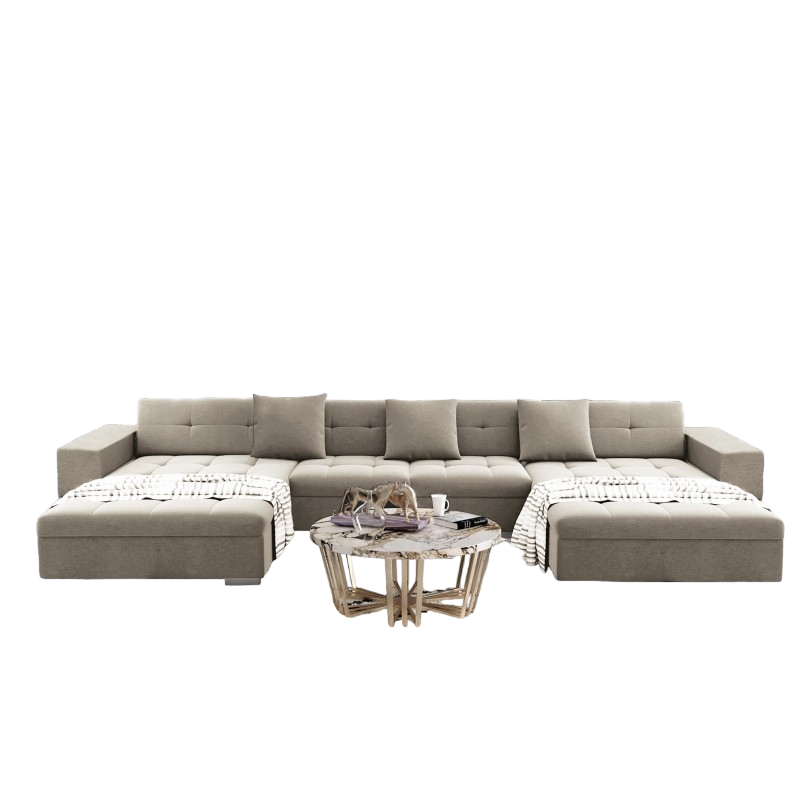 Le canapé panoramique ANIXE est le produit qu'il vous faut grâce à son design moderne et ultra tendance. Ce modèle existe également en version convertible avec un lit gigogne sous l'assise centrale. Il s'agit d'une option en supplément, vous pouvez le sélectionner dans le menu déroulant sous le prix. Le canapé est entièrement en tissu pour les couleurs unies et il est en tissu et simili cuir pour les déclinaisons bi-couleurs en gris et noir et gris blanc Longueur : 385 cm - Profondeur méridienne : 160 cm Sa grande taille conçue pour les grands espaces vous permettra d’accueillir toute votre famille et vos amis. Il y aura de la place et de l'espace pour tout le monde ! Ce canapé propose une assise ni trop molle ni trop dur. L'assise de base est relativement ferme pour offrir une bonne tenue dans le temps. Ses 2 larges méridiennes et ses pieds en plastique "effet chromé" apporteront caractère et modernité à votre pièce. Les assises et dossiers capitonnés avec un revêtement en tissu 100% polyester renforce le côté moderne de ce canapé panoramique. Le Montage est très facile. Ce canapé est composé de 3 parties qu'il suffit simplement d'emboiter. Aucun montage et aucun tournevis n'est nécessaire, un vrai jeu d'enfant ! Le montage se fait en quelques minutes. Fabrication européenne = gage de qualité Fabriqué à la main en Europe en utilisant des matériaux de qualité, le canapé d’angle panoramique ANIXE offre un excellent rapport qualité prix. Sa structure est composée de bois et son assise qui repose sur des ressorts nosag et de la mousse polyuréthane de densité de 28kg/m3 lui garantissent la durée dans le temps et une résistance aux assauts quotidiens de toute la famille.