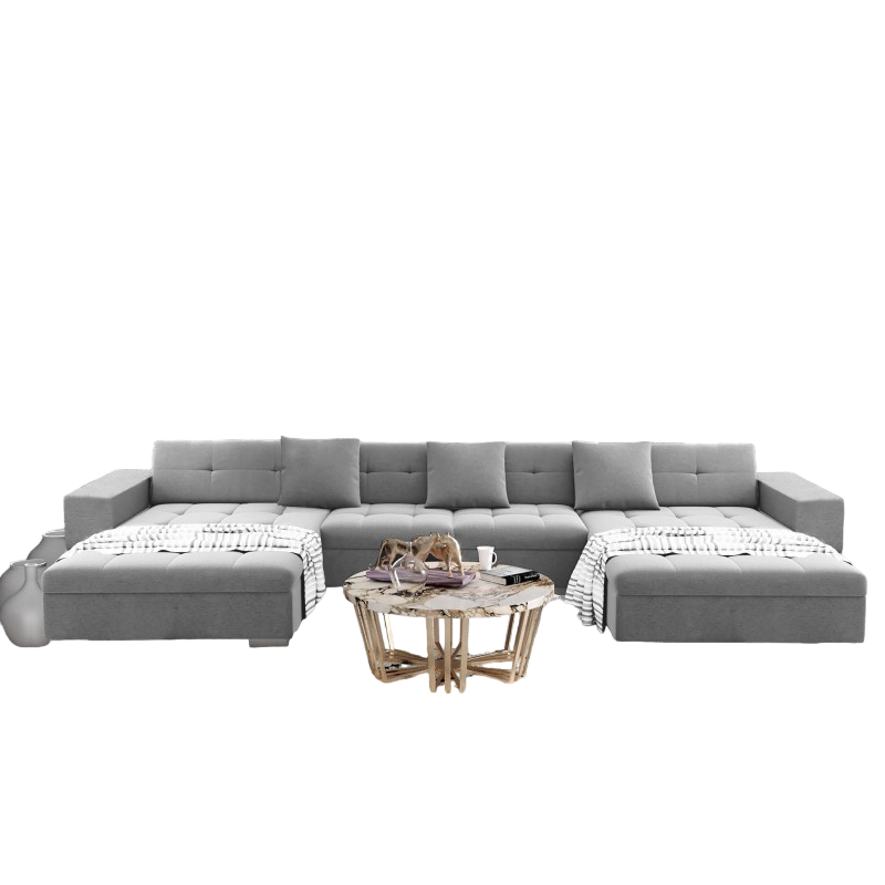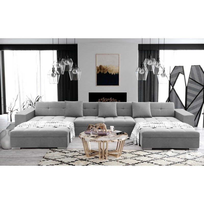 Le canapé panoramique ANIXE est le produit qu'il vous faut grâce à son design moderne et ultra tendance. Ce modèle existe également en version convertible avec un lit gigogne sous l'assise centrale. Il s'agit d'une option en supplément, vous pouvez le sélectionner dans le menu déroulant sous le prix. Le canapé est entièrement en tissu pour les couleurs unies et il est en tissu et simili cuir pour les déclinaisons bi-couleurs en gris et noir et gris blanc Longueur : 385 cm - Profondeur méridienne : 160 cm Sa grande taille conçue pour les grands espaces vous permettra d’accueillir toute votre famille et vos amis. Il y aura de la place et de l'espace pour tout le monde ! Ce canapé propose une assise ni trop molle ni trop dur. L'assise de base est relativement ferme pour offrir une bonne tenue dans le temps. Ses 2 larges méridiennes et ses pieds en plastique "effet chromé" apporteront caractère et modernité à votre pièce. Les assises et dossiers capitonnés avec un revêtement en tissu 100% polyester renforce le côté moderne de ce canapé panoramique. Le Montage est très facile. Ce canapé est composé de 3 parties qu'il suffit simplement d'emboiter. Aucun montage et aucun tournevis n'est nécessaire, un vrai jeu d'enfant ! Le montage se fait en quelques minutes. Fabrication européenne = gage de qualité Fabriqué à la main en Europe en utilisant des matériaux de qualité, le canapé d’angle panoramique ANIXE offre un excellent rapport qualité prix. Sa structure est composée de bois et son assise qui repose sur des ressorts nosag et de la mousse polyuréthane de densité de 28kg/m3 lui garantissent la durée dans le temps et une résistance aux assauts quotidiens de toute la famille.