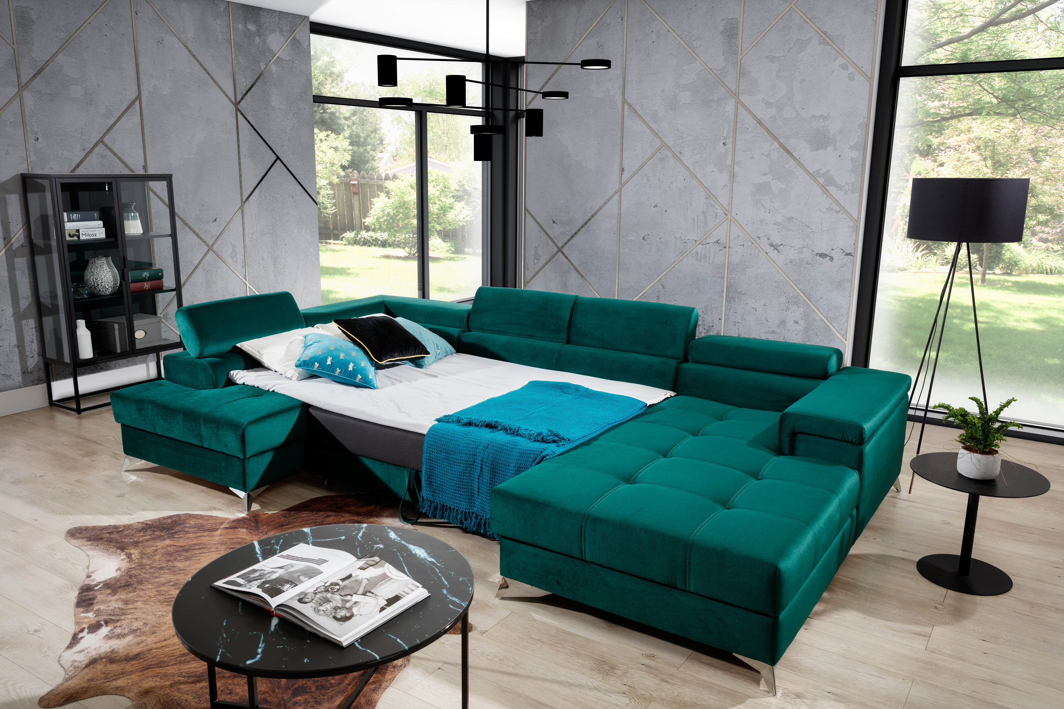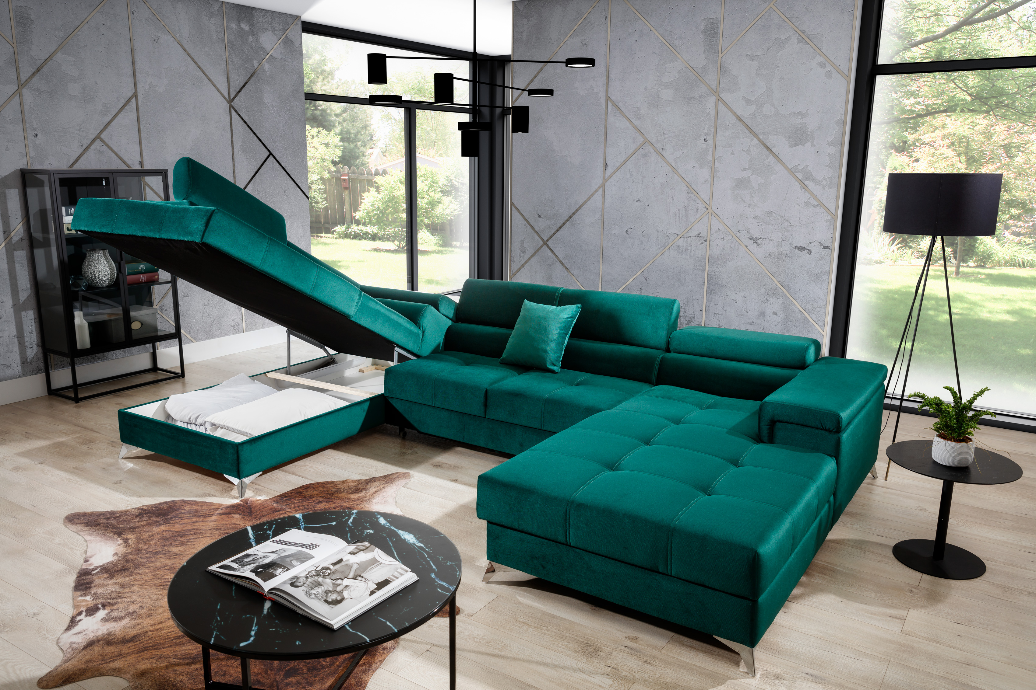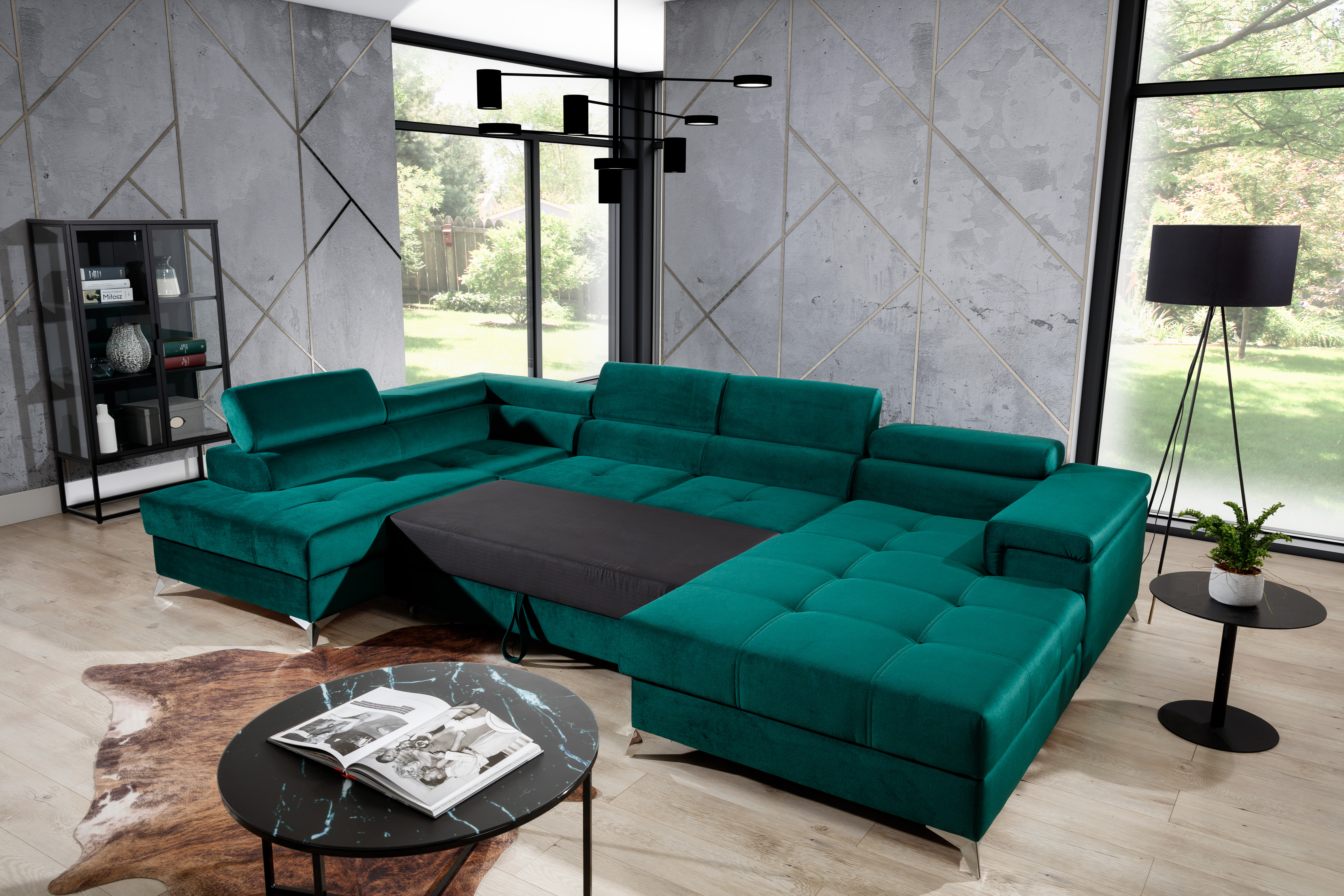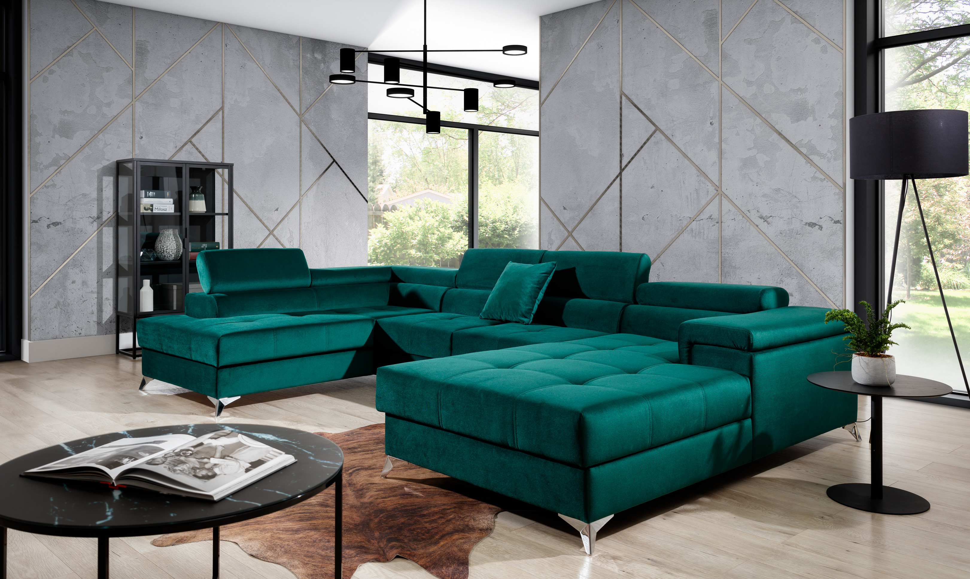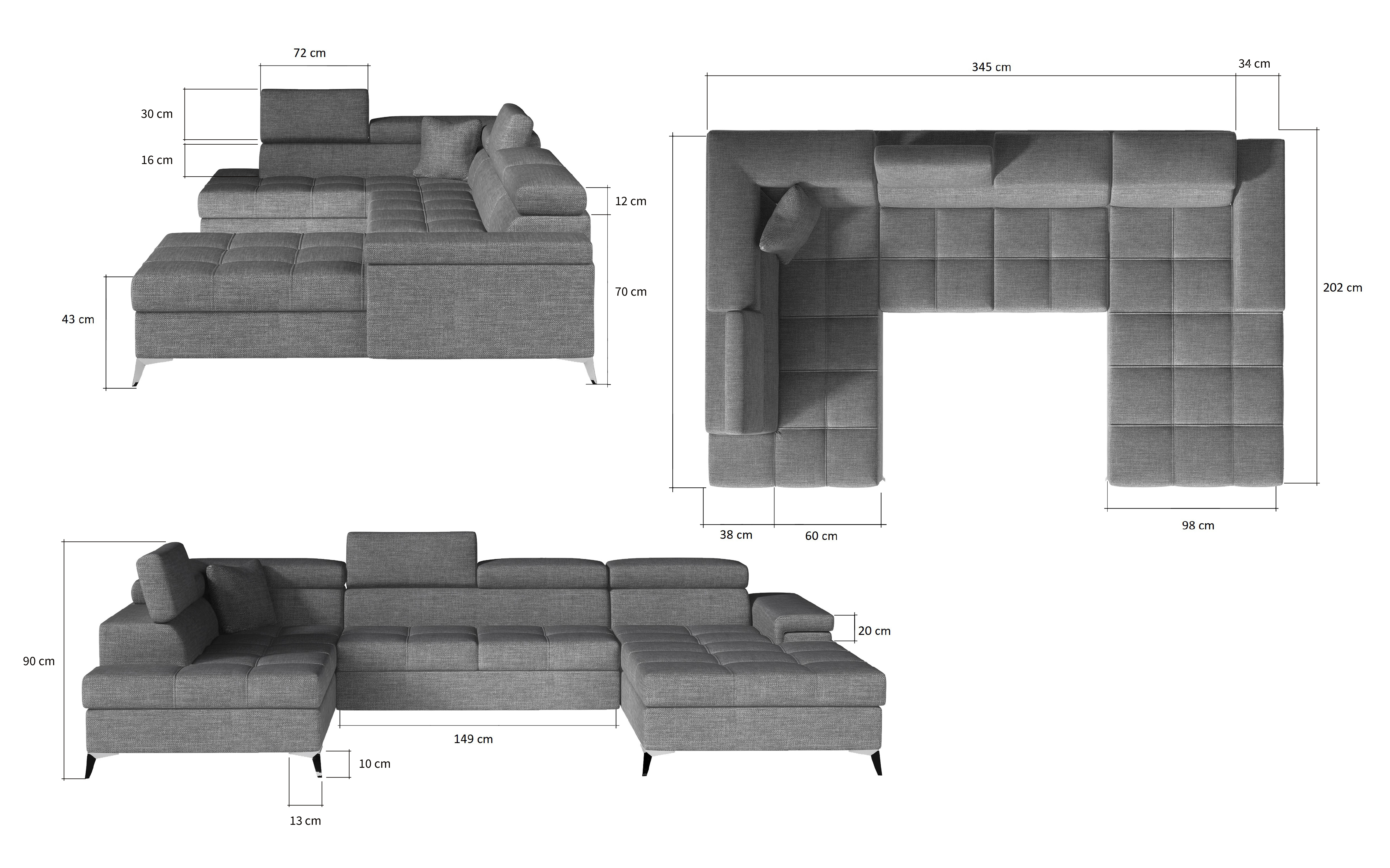 Le canapé d'angle avec des appuies-têtes réglables Kutty offre beaucoup d'espace pour que toute la famille puisse se détendre, et avec ses coussins d'assise profonds et ses deux poufs spacieux et moelleux, il est parfait pour une frénésie télé en famille ou entre amis. C'est plus qu'un canapé spacieux pour la détente diurne, c'est un lit avec un grand lit pliant de 125x265 cm. Il est rembourré avec une mousse HR 30 innovante, un rembourrage qui assure une résilience et une douceur supérieures pour un niveau de confort amélioré. La forme moderne du canapé d'angle se marie bien avec d'élégants pieds en métal suffisamment hauts pour laisser passer un robot aspirateur en dessous. Il est disponible dans une large sélection de tissus d'ameublement, avec de nombreuses couleurs et textures différentes pour que vous puissiez choisir la bonne option pour correspondre à votre salon. Modèle : 5 places - 2 angles Largeur du canapé : 345 cm Méridienne droite vue de face : L 103 x H 43 x P 202 cm Méridienne gauche vue de face avec coffre de rangement : L 106 x H 43 x P 202 cm Espace entre les 2 méridiennes : 140 cm Profondeur : 90 cm Profondeur d'assise : 60 cm Hauteur : 90 cm - sans coussins 70 cm Hauteur d'assise : 43 cm Surface de couchage: 125x265 cm g]Poids : 225 kg Coloris : gris chiné et noir Revêtement structure : PU - 100% PU - Garnissage poids : 425 g/m². - Résistance du revêtement à l'abrasion - Inflammable et anti-taches Revêtement assise et dossier : tissu italien haute qualité - 100% polyester - Garnissage poids : 315 g/m². - Résistance du revêtement à l'abrasion - Inflammable et anti-taches Structure : Bois massif et panneau de particules Pieds en métal chromé : argenté Matière et densité dossier assise : - Assise : Mousse polyester 30 kg/m³ HR - Dossier et accoudoirs : 30 kg/m³ HR - Rembourrage : Ressort ondulé Mousse de haute qualité et hautement élastique Fabrication européenne - Garantie 5 ans 3 colis : 1: 206x110x85 – 78KG - 2: 150x85x100 – 69KG - 3: 206:110:85 – 80KG"87 kg / 174x 111x76 cm, 79 kg