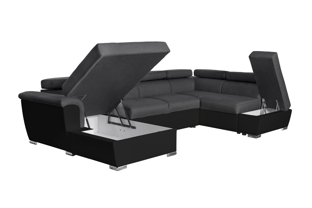 Canapé panoramique convertible avec 2 coffres PAOLA en tissu et simili - Gris/Noir
