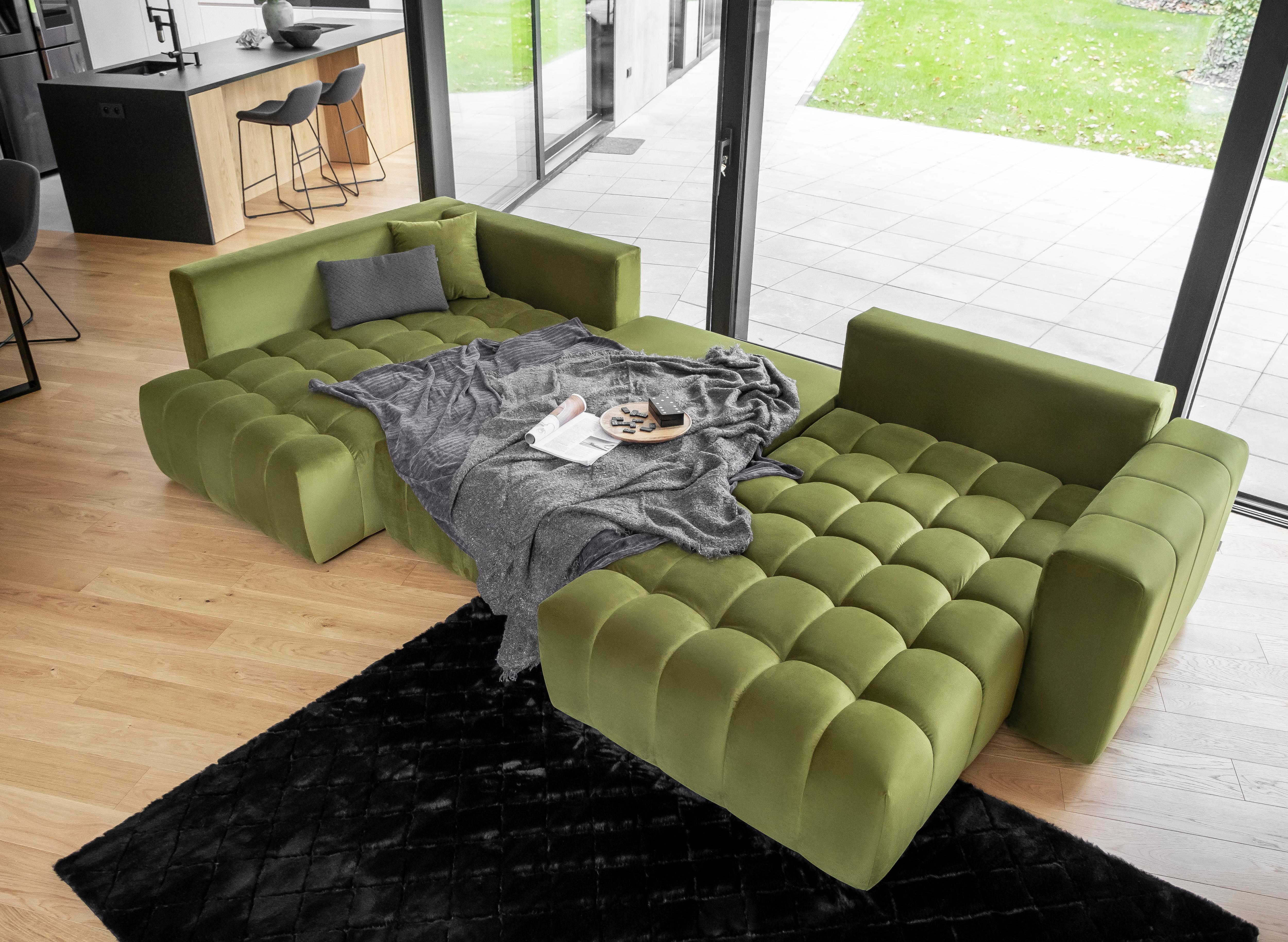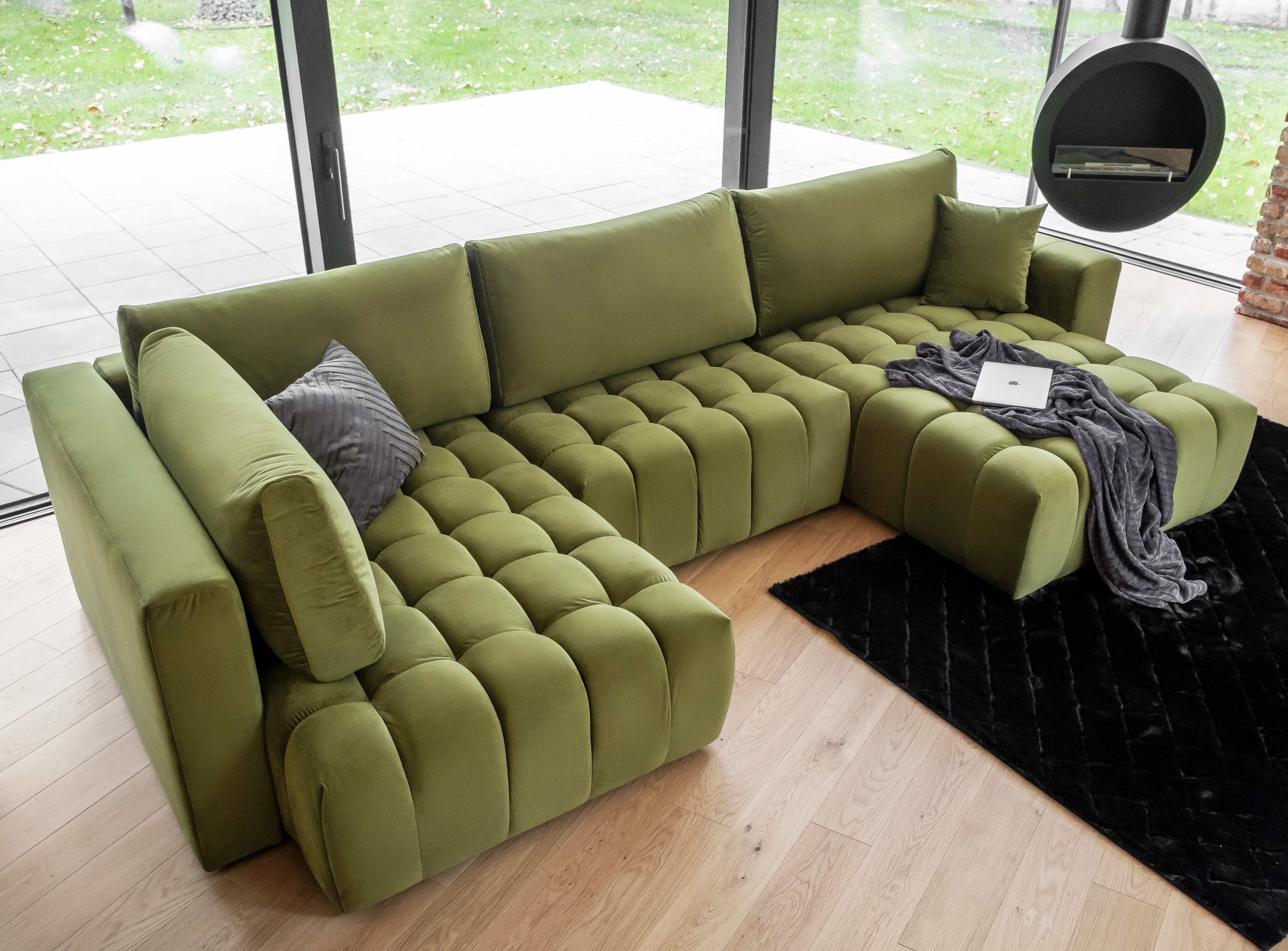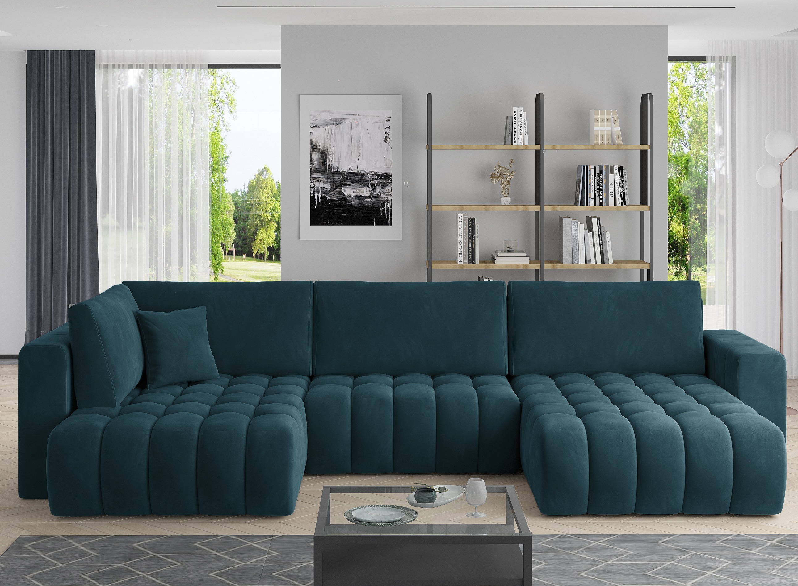 Canapé panoramique convertible design capitonné velours bleu canard méridienne droite Boston 350cm