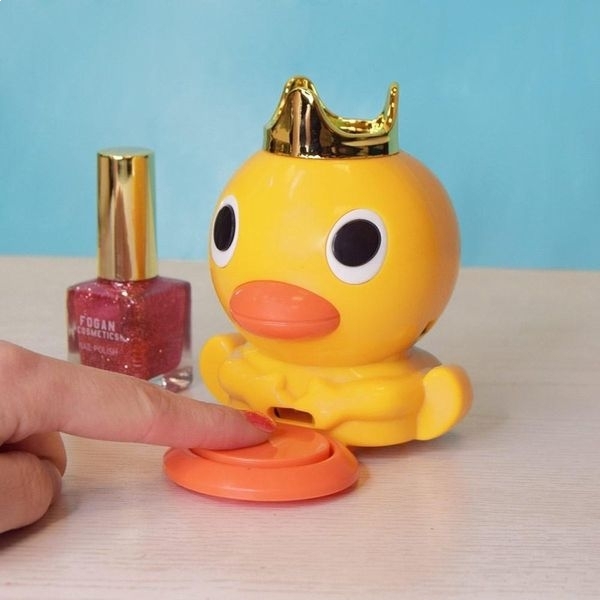Plus besoin d'épuiser votre souffle lorsque vous séchez vos ongles et ayez à votre disposition ce canard sèche-ongles. Il vous suffit de mettre votre doigt sur le bouton devant son bec pour qu'un souffle sèche votre vernis.* Dimensions : 11 x 9 x 9 cm * Couleur : jaune et orange * Matière : PVC * Batterie : 2 piles AAA (non fournies) Fonctions : sèche ongles soufflant Contenu : 1 sèche ongles petit canard