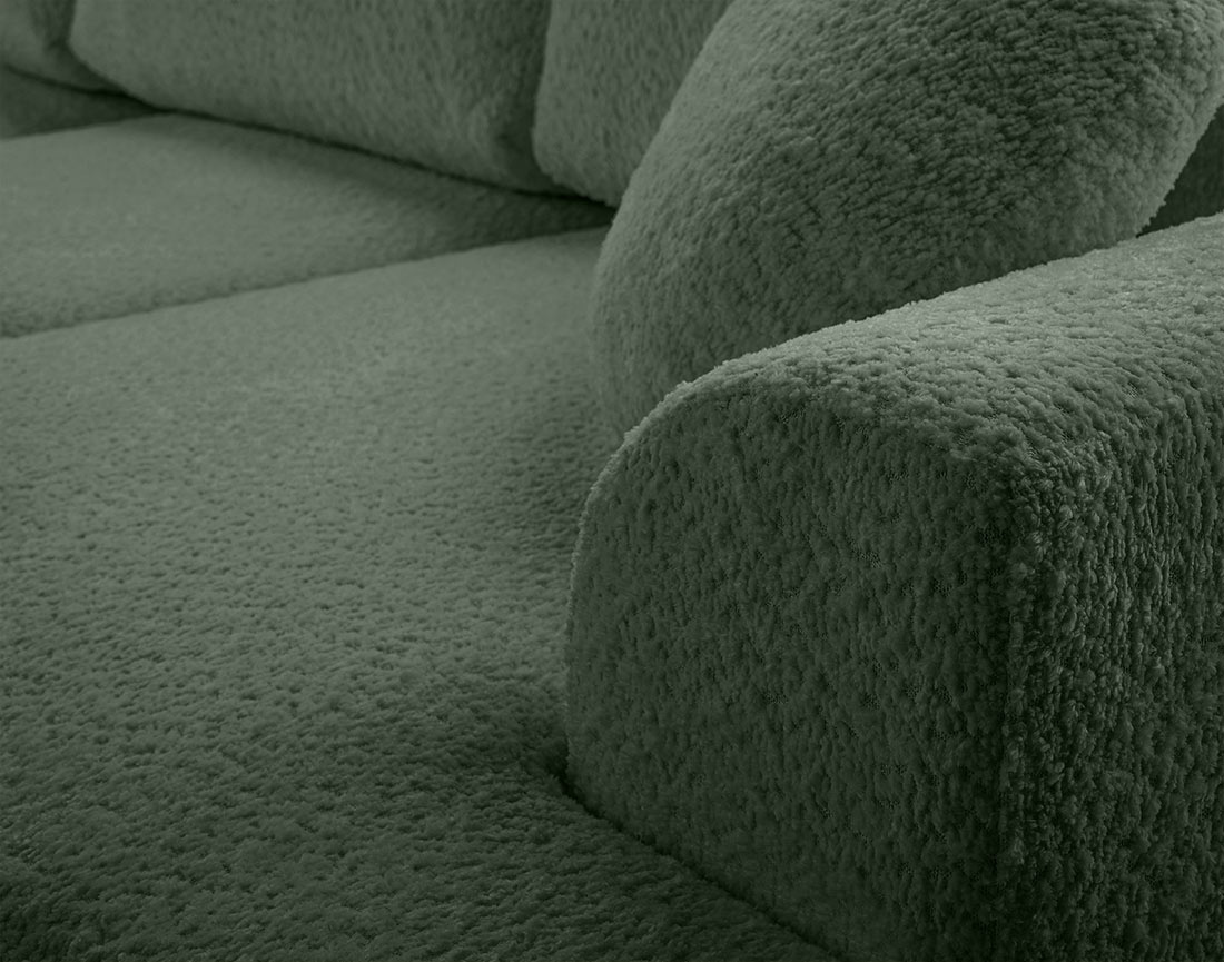 - Détail des matières : Assise : Mousse polyuréthane 30kg/m3 – Dossier : Flocons de mousse - Ressorts zig-zags – Structure : Bois aggloméré et panneaux de particules - Revêtement en tissu bouclette 100% polyester - Pieds en plastique noir