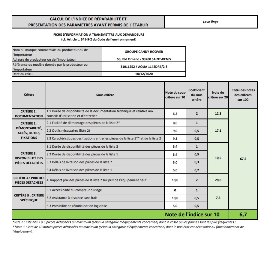 | Consommation d’énergie pour 100 cycles (kwh) | 69 |
