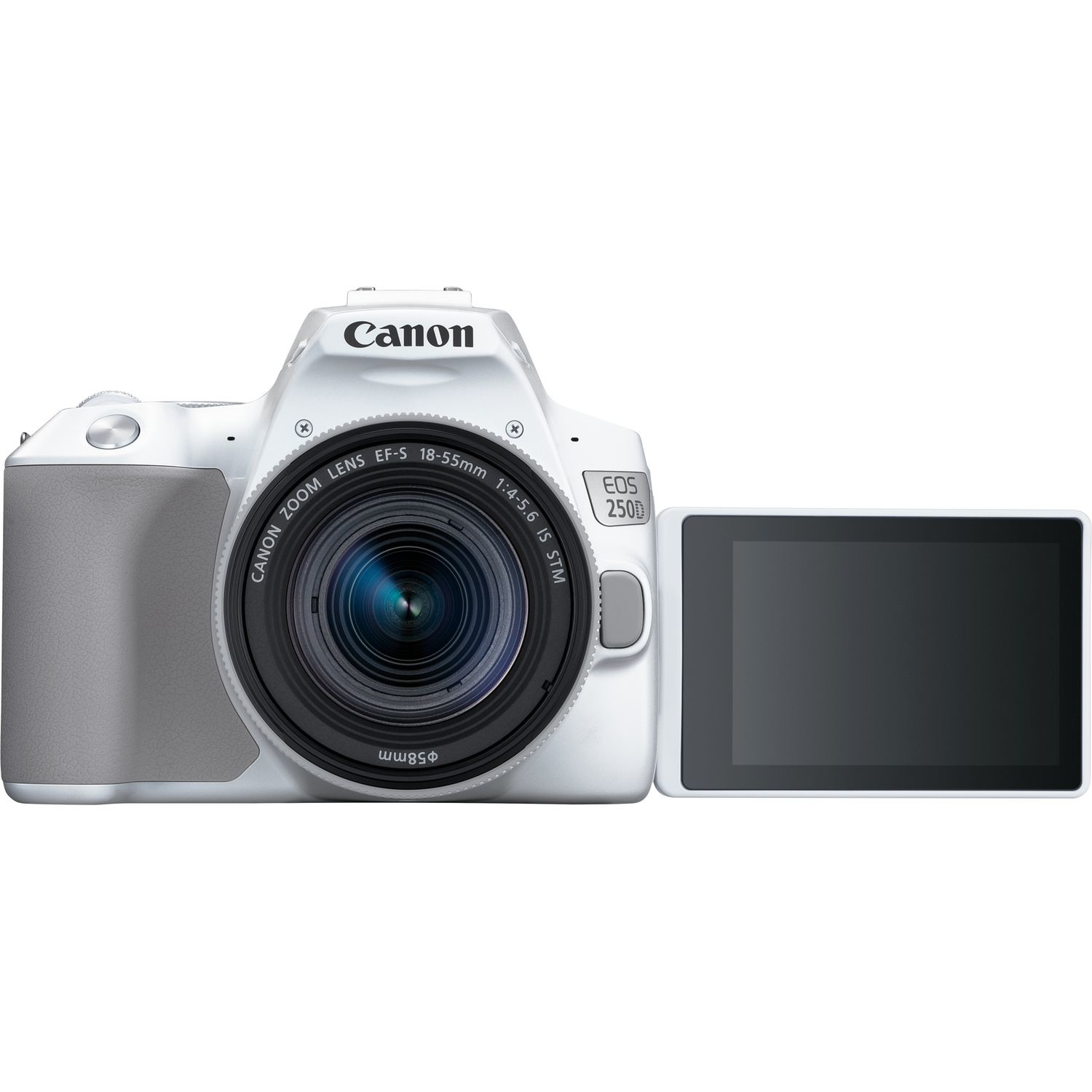Canon EOS 250D + EF-S 18-55mm f/4-5.6 IS STM. Type d'appareil photo: Kit d'appareil-photo SLR, Mégapixel: 24,1 MP, Type de capteur: CMOS, Résolution d'image maximale: 6000 x 4000 pixels. La sensibilité ISO (max): 51200. Longueur focale: 18 - 55 mm. Wifi. Type HD: 4K Ultra HD, Résolution vidéo maximale: 3840 x 2160 pixels. Taille de l'écran: 7,62 cm (3"), Écran tactile. Viseur d'appareil photo: Optique. PictBridge. Poids: 449 g. Couleur du produit: Blanc