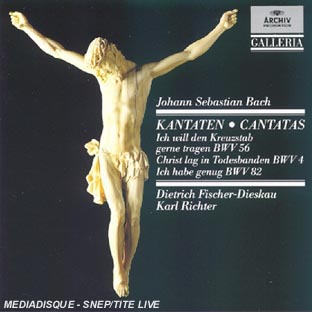 Liste des pistes 1.1 . cantate bwv 56 : arie "ich will den kreuzstab gerne tragen" - Jean-Sébastien Bach 1.2 . cantate bwv 56 : rezitativ "mein wandel auf der welt" - Jean-Sébastien Bach 1.3 . cantate bwv 56 : arie "endlich, endlich wird mein joch" - Jean-Sébastien Bach 1.4 . cantate bwv 56 : rezitativ "ich stehe fertig und bereit" - Jean-Sébastien Bach 1.5 . cantate bwv 56 : choral "komm, o tod, du schlafes bruder" - Jean-Sébastien Bach 1.6 . cantate bwv 4 : sinfonia - Jean-Sébastien Bach 1.7 . cantate bwv 4 : versus i "christ lag in todesbanden" - Jean-Sébastien Bach 1.8 . cantate bwv 4 : versus ii "den tod niemand zwingen kunnt" - Jean-Sébastien Bach 1.9 . cantate bwv 4 : versus iii "jesus christus, gottes sohn" - Jean-Sébastien Bach 1.10 . cantate bwv 4 : versus iv "es war ein wunderlicher krieg" - Jean-Sébastien Bach 1.11 . cantate bwv 4 : versus v "hier ist das rechte osterlamm" - Jean-Sébastien Bach 1.12 . cantate bwv 4 : versus vi "so feiern wir das hohe fest" - Jean-Sébastien Bach 1.13 . cantate bwv 4 : versus vii "wir essen und wir leben wohl" - Jean-Sébastien Bach 1.14 . cantate bwv 82 : arie "ich habe genug" - Jean-Sébastien Bach 1.15 . cantate bwv 82 : rezitativ "ich habe genug, mein trost ist nur allein" - Jean-Sébastien Bach 1.16 . cantate bwv 82 : arie "schlummert ein, ihr matten augen" - Jean-Sébastien Bach 1.17 . cantate bwv 82 : rezitativ "mein gott! wann kommt das schone:nun!" - Jean-Sébastien Bach 1.18 . cantate bwv 82 : arie "ich freue mich auf meinen tod" - Jean-Sébastien Bach