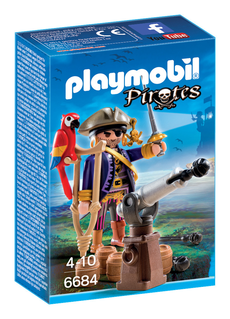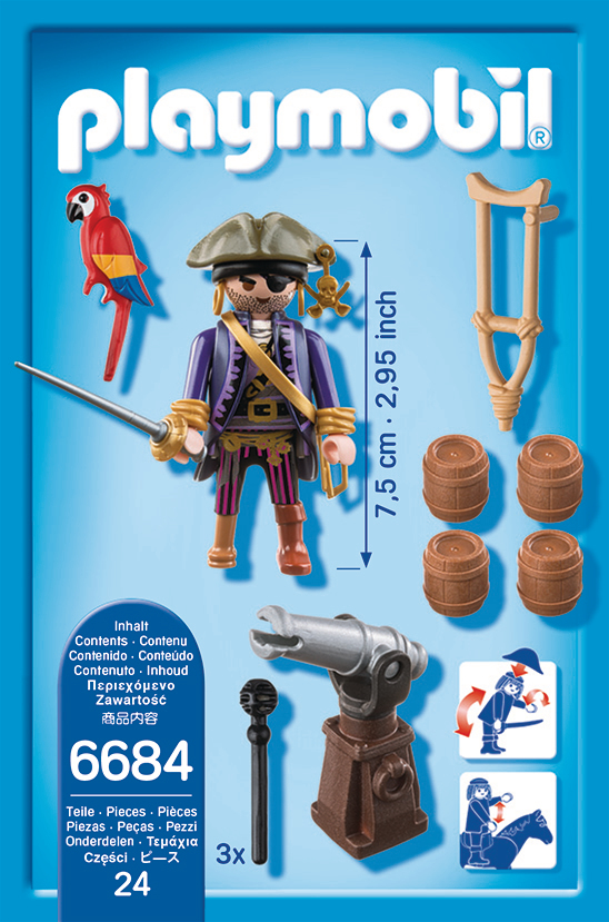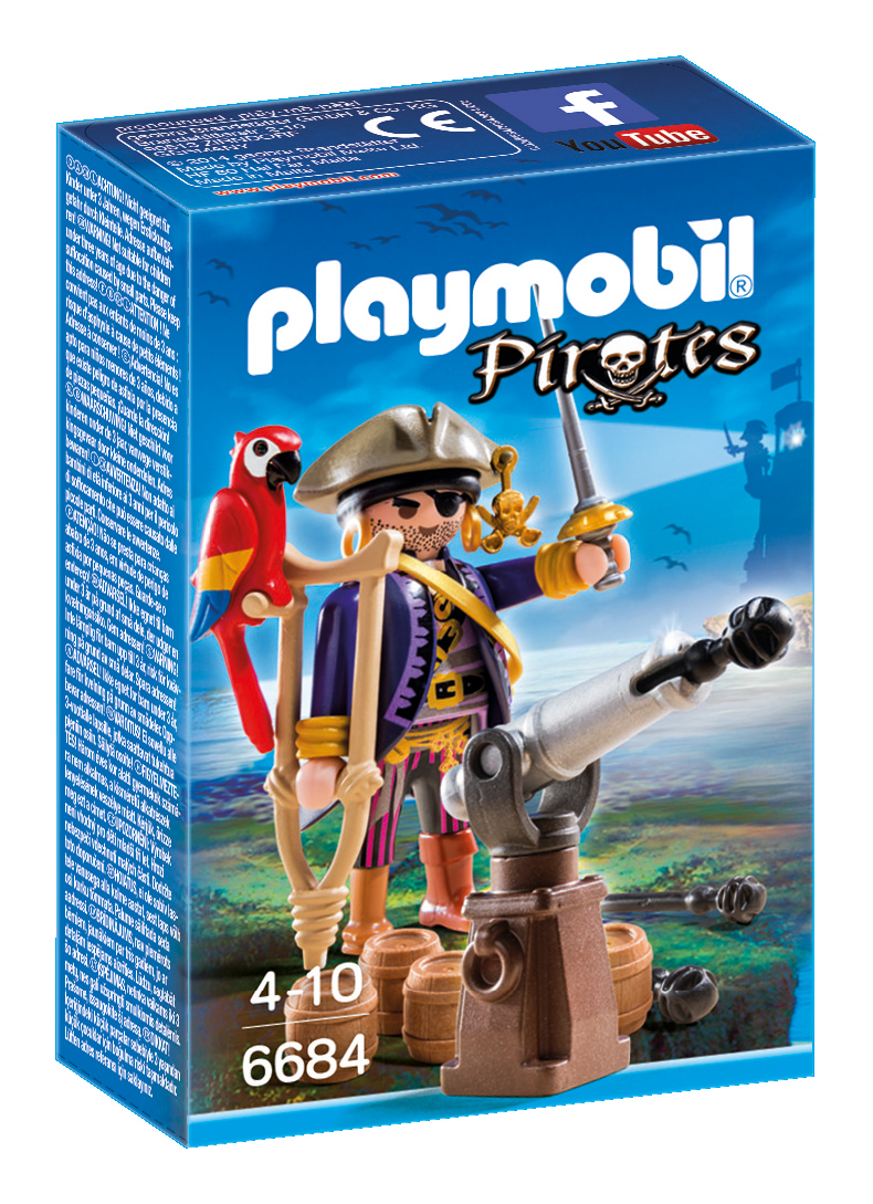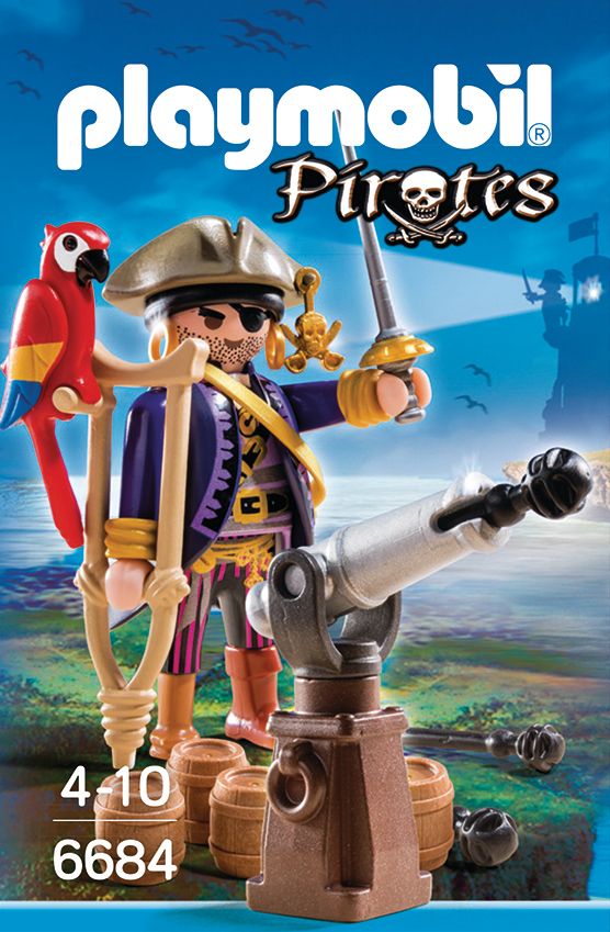 La boîte contient Contient 1 personnage, 1 canon avec projectiles et des accessoires (barils de poudre, épée, béquille). Le canon tire des projectiles.