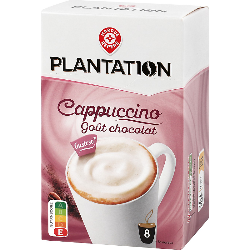 Préparation en poudre pour boisson instantanée à base de poudre de lait écrémé, de café soluble et de cacao en poudre en sachets individuels. PLANTATION