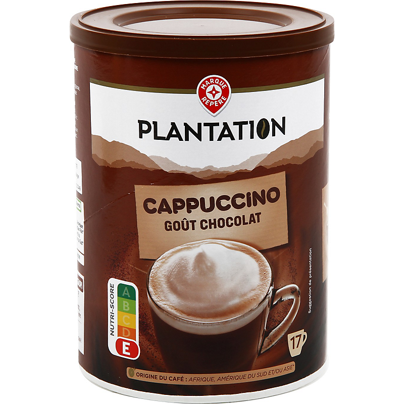 Préparation en poudre pour boisson instantanée à base de poudre de lait écrémé, de café soluble et de cacao en poudre PLANTATION