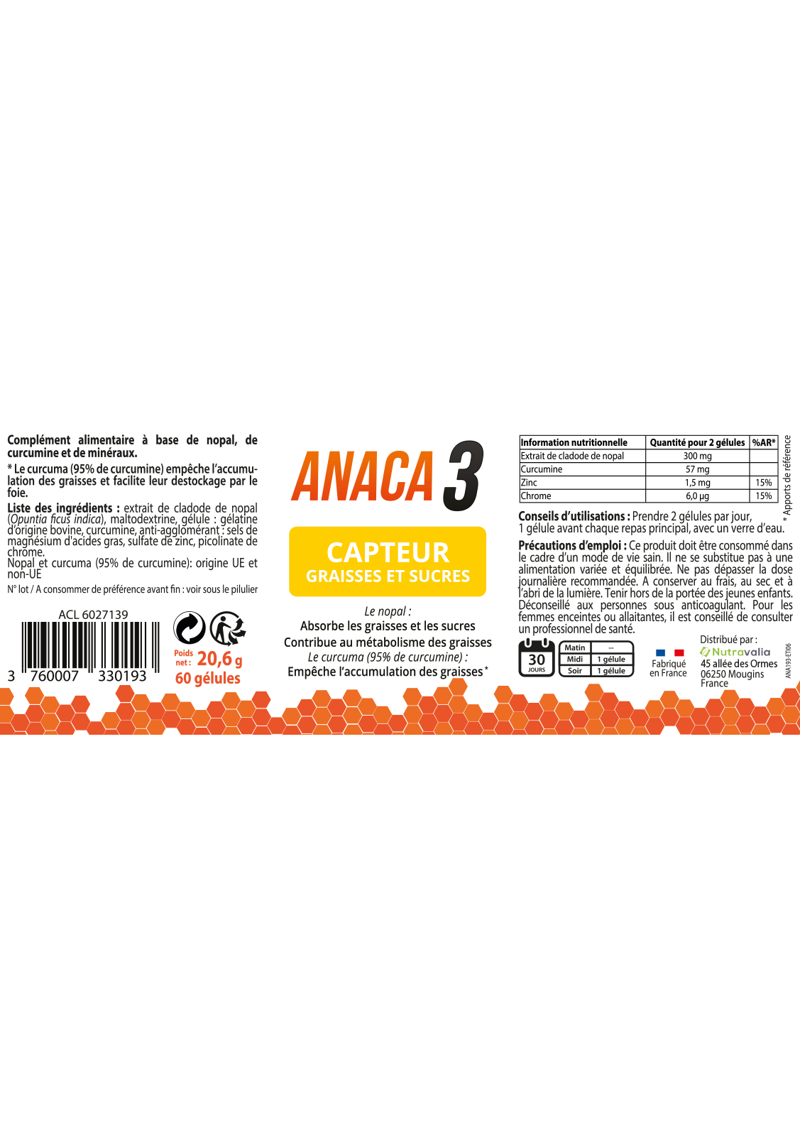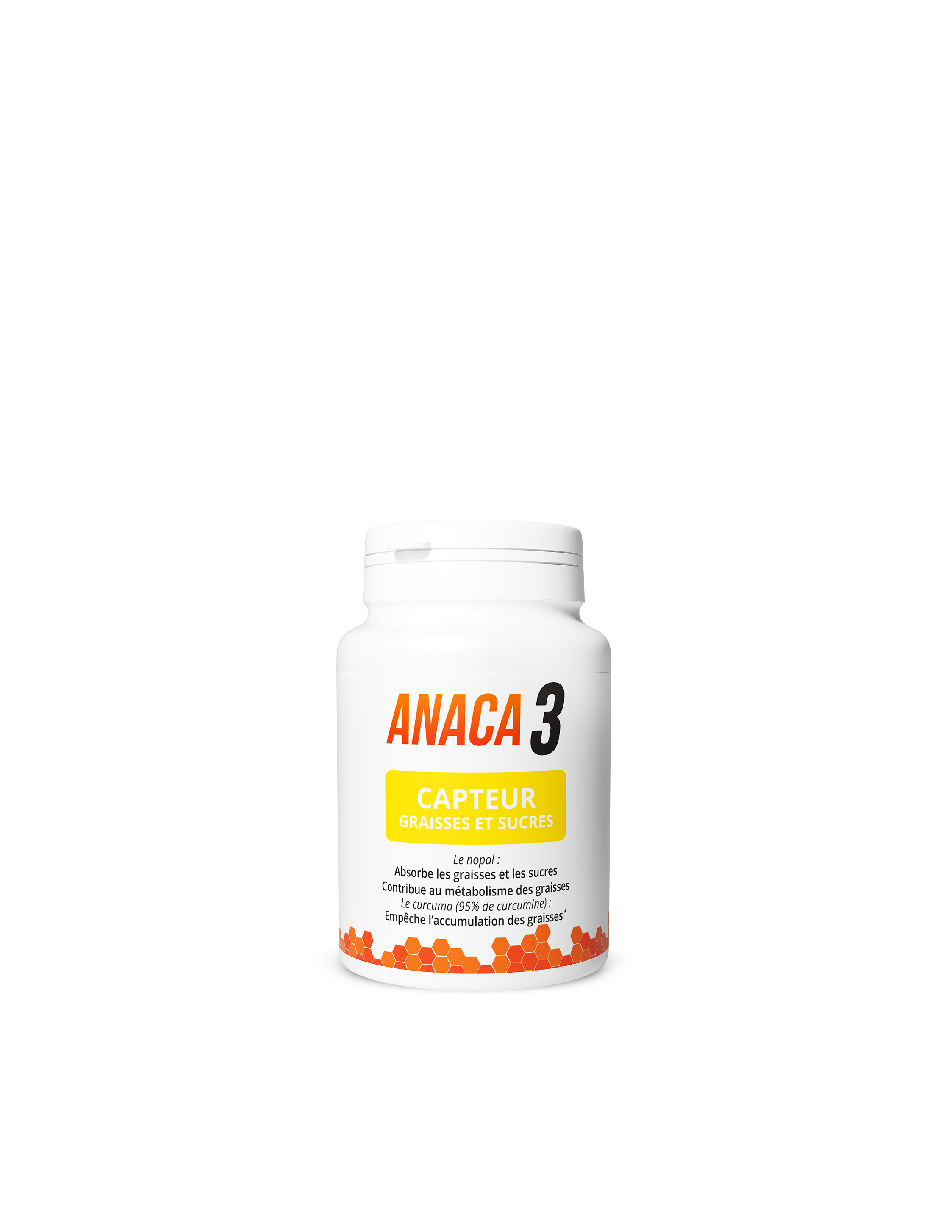 Anaca3 Capteur Graisses et Sucres 60 Gélules est un complément alimentaire composé de nopal, curcumine et minéraux conçu pour absorber les graisses et les sucres et empêcher l'accumulation des graisses. Le nopal absorbe les graisses et les sucres, contribue au métabolisme des graisses et aide à contrôler les programmes d'amincissement en réduisant l'appétit et l'apport calorique. Le curcuma empêche l'accumulation des graisses et facilite le destockage des graisses par le foie. Le zinc contribue à un métabolisme glucidique normal, au métabolisme normal des acides gras et au métabolisme normal des macronutriments. Le chrome contribue au maintien d'une glycémie normale et au métabolisme normal des macronutriments.