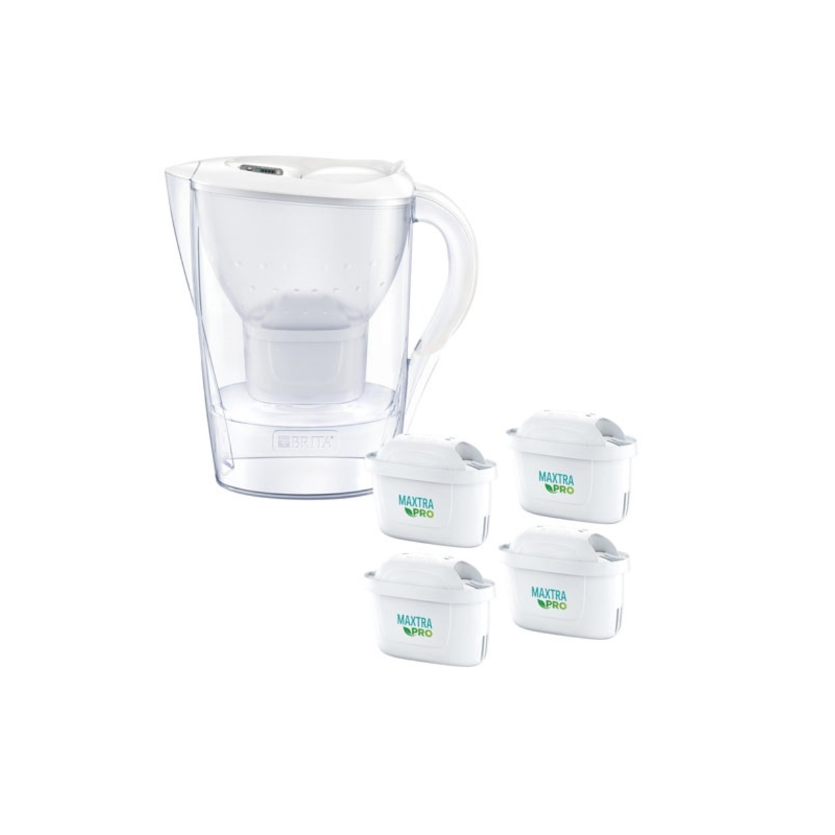 1051514 - carafe filtrante 2.4l avec cartouche maxtra - Lot 4 cartouches Maxtra Pro All-in-1 + Carafe 2,4 L Marella blanche offerte. Découvrez une eau au goût encore meilleur ! Pour une eau du robinet plus pure au goût agréable et une réduction du tartre ! Pour boissons froides ou chaudes. Pour 4 mois de filtration soit 600 L d'eau filtrée. Chaque cartouche permet un mois de filtration (150 L d'eau filtrée soit +50% de plus qu'avec une cartouche Maxtra+). Nouvelle cartouche Maxtra Pro All-in-1 pour une eau plus pure grâce aux nouvelles micro-perles de charbon actif. Maxtra Pro : la nouvelle génération de cartouches plus durables avec de meilleures performances de filtration. Maillage ultra-fin : retient les particules venant des canalisations. Les micro-perles de charbon actif, élaborées à partir d’écorces naturelles de noix de coco réduisent le chlore et les substances pouvant impacter le goût et l’odeur de l’eau du robinet et réduisent les traces d’impuretés telles que certains pesticides, herbicides et résidus médicamenteux - Des perles échangeuses d’ions efficaces empêchent la formation de tartre pour protéger les appareils ménagers et retiennent certains métaux tels que le plomb et le cuivre. Maillage ultra-fin supplémentaire qui réduit les particules fines jusqu'à 30 µm : jusqu’à 4 fois plus efficace par rapport au filtre à eau Maxtra+ - 4 cartouches Maxtra Pro All-in-1 pour 4 mois de filtration : 150 L d'eau filtrée par cartouche soit 600 L (+50% de plus qu'avec une cartouche Maxtra+ - Couvercle et coque du filtre composés de 50% de plastique biosourcé - Cartouche recyclable si rapportée dans l’un des points de collecte participant.