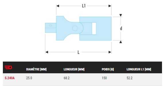 | Libellé | Cardan universel 1/2'' 68,2mm - FACOM - S.240A |