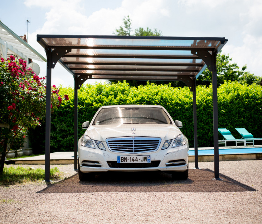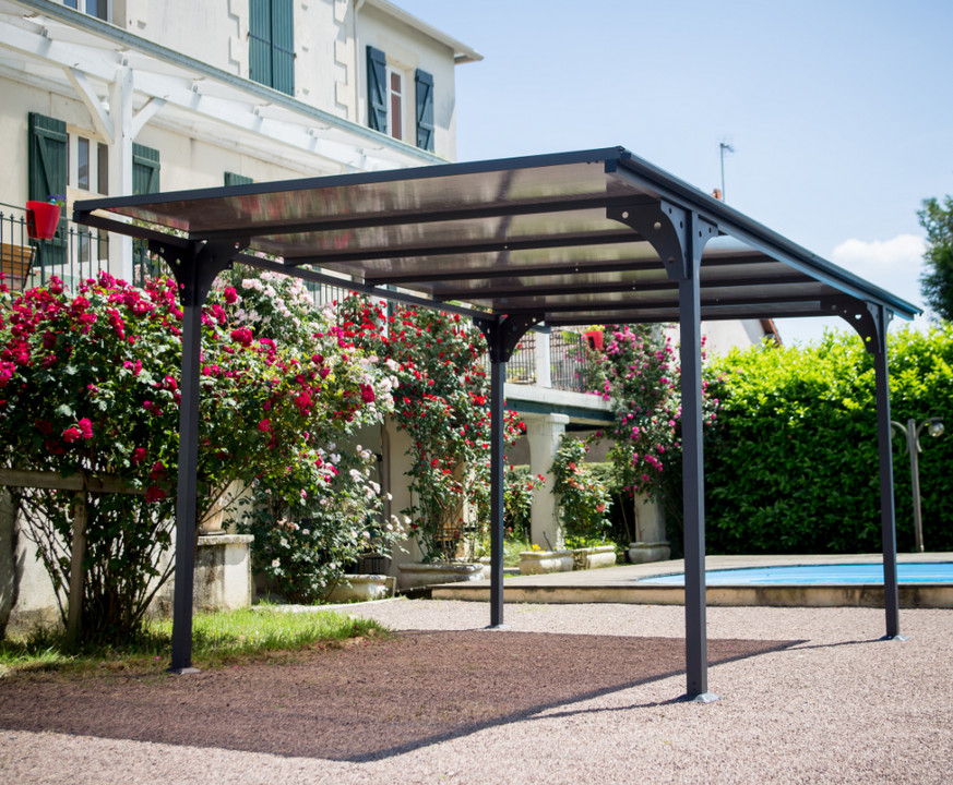 Carport ALUMINIUM toit plat coloris gris anthracite / surface extérieure : 14,70 m2 / toit avec plaques en POLYCARBONATE ANTI-UV 6 mm