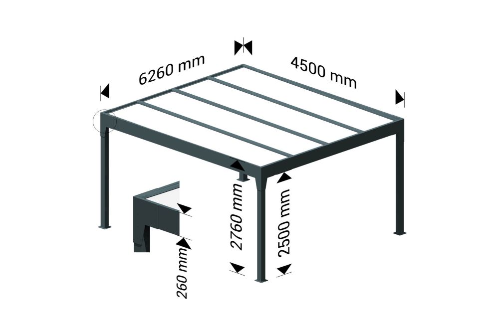 - Dimensions (largeur x avancée) : 6,26 x 4,50 m