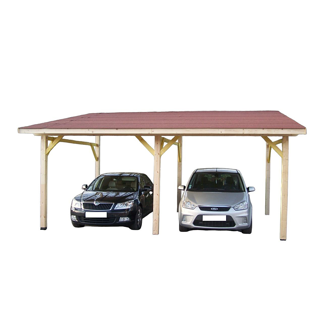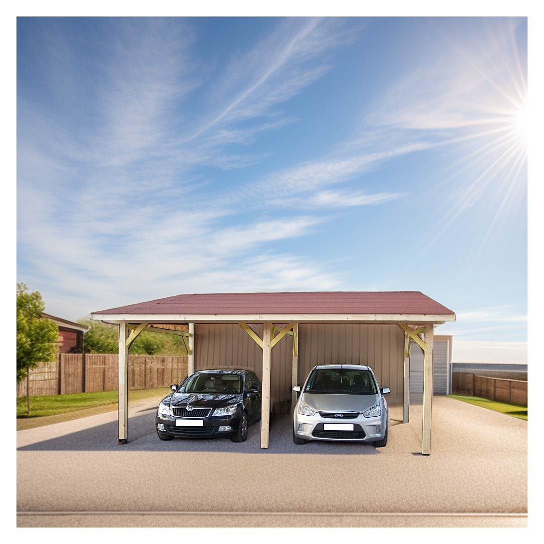Carport monopente 2 voitures/ 6 poteaux section 120 x 120 mm/ Couverture Bardeau bitumér / Assemblage ten