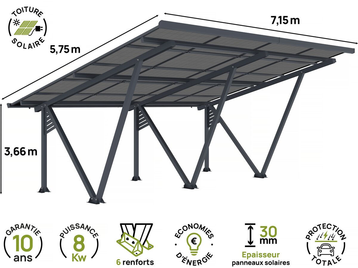 Couleur:Gris.Structure:Notre carport en aluminium se distingue par sa structure robuste avec 9 renforts muraux pour une stabilité inébranlable. Les panneaux photovoltaïques intégrés sont fabriqués en aluminium durable. La garantie de 10 ans assure une longue durée de vie.Dimensions Hors Tout:715 x 556 x 366 cm.Dimensions poteaux:10 x 10 cm.Nombre de poteaux:9.Type de toiture / inclinaison:15° - Toiture étanche.Résistance au vent:30m/s.Conseils d'installation:- Système de drainage pour l'évacuation de l'eau - Gouttière inclus - Largeur du carport ajustable - Anti UV - Anti rouille .Gouttière, descente d'eau:Inclus.Poids maximum supporté:100kgs/m2.conseil d'utilisation:Un carport solaire va au-delà du simple stationnement des véhicules en produisant de l'énergie solaire, notamment les coûts énergétiques et l'impact environnemental. Il offre une utilisation polyvalente en tant que zone de stockage et source d'ombre. Il peut également inclure des bornes de recharge pour véhicules électriques et valoriser la propriété, ce qui en fait un investissement multifonctionnel pour les propriétaires soucieux de la durabilité.Garantie:10 ans.le + produit:- Anti UV - Anti rouille 410Wc , production d'énergie constante même en faible ensoleillement Performance stable : production 84.8% garantie à 25 ans Câbles 1200mm MC4 - Garantie 10 ans - Garantie 10 ans.Type de panneau:Panneau photovoltaïque.Puissance par panneau:410W.Courant au MPP* Impp [A]:12.88V.Tension au MPP* Umpp [V]:31.83V.Tension à vide* Uoc [V]:37.98.Câble:1200mm.Connecteur:MC4.Classe de sécurité:Classe II.Poids par panneau:20,5 kg.Epaisseur panneau:30 mm.Nombre de panneaux inclus:20.Dimensions:172,2 x 113,4 x 3 cm.Type de cellules:182mm.Nombre de cellules:10.Matière du cadre:Aluminium anodisé noir.Boîte de jonction:IP68.épaisseur panneau:30mm.Garantie:84.8% à 25 ans.Colisage:4 colis : - 3,71 x 0,94 x 0,34 m, 245 kg - 5,065 x 0,275 x 0,185 m, 49 kg - 5,735 x 0,29 x 0,145 m, 57 kg - 1,755 x 0,73 x 1,275 m, 455 kg.Forme t