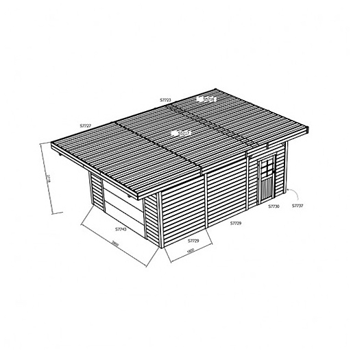 Carport en sapin du Nord certifié et imprégné, dimensions 506X706CM, épaisseur des parois 28mm et des poteaux 12X12CM. Toiture: toit plat. Inclus: Porte de garage sectionelle motorisée, simple porte avec verre trempé et poignée avec serrure, tôles métaliques et pcv transparentes.