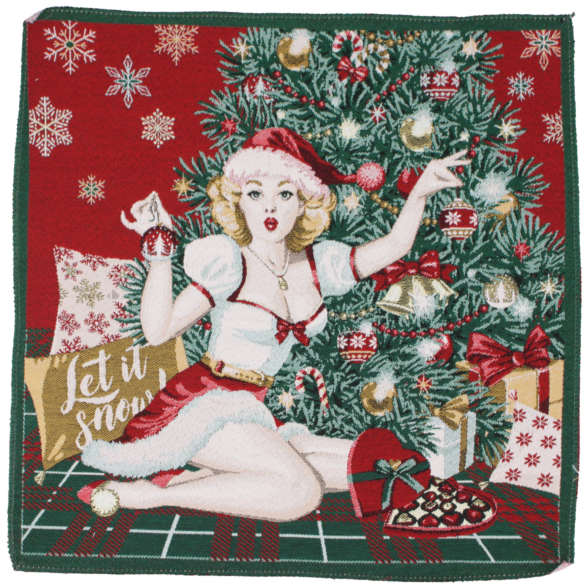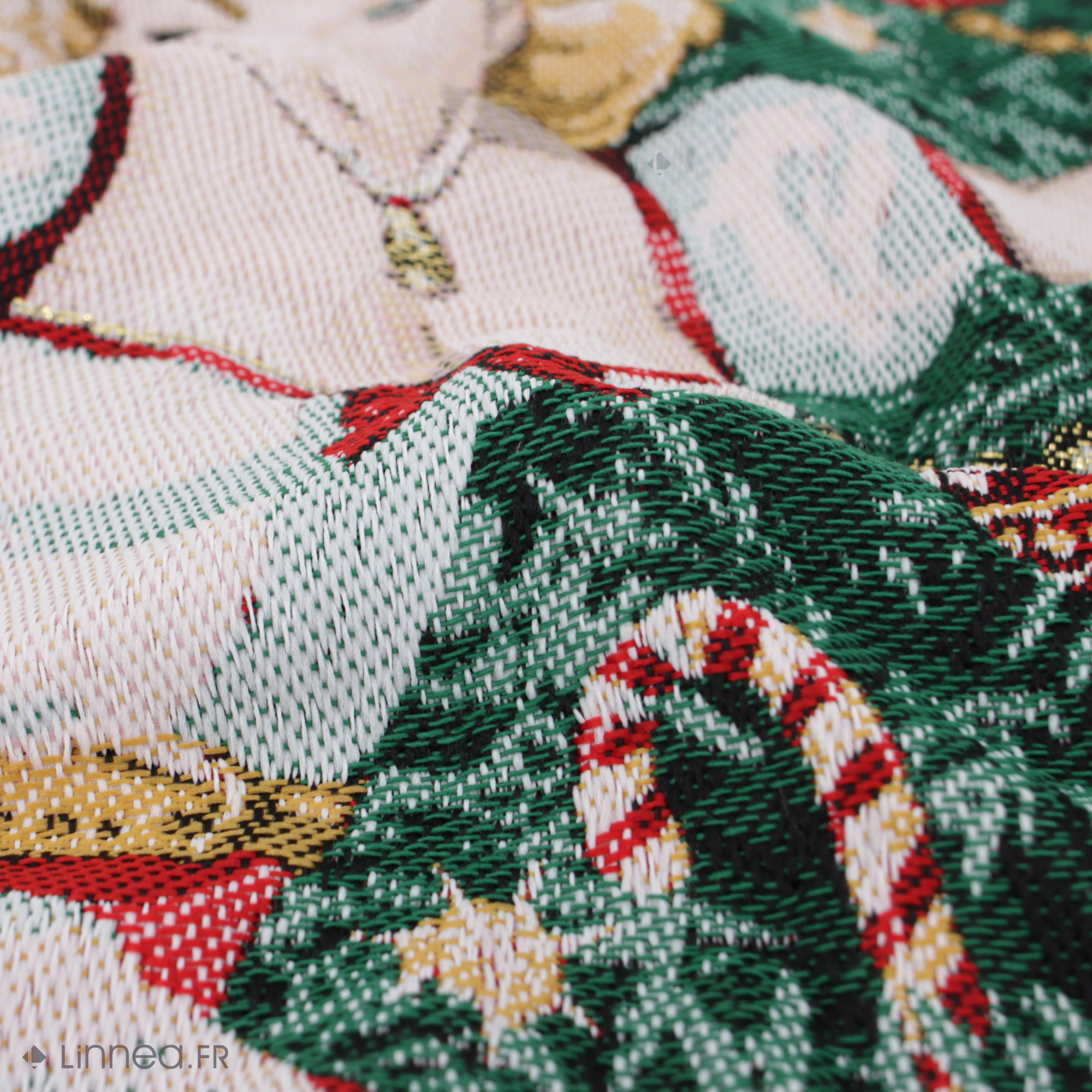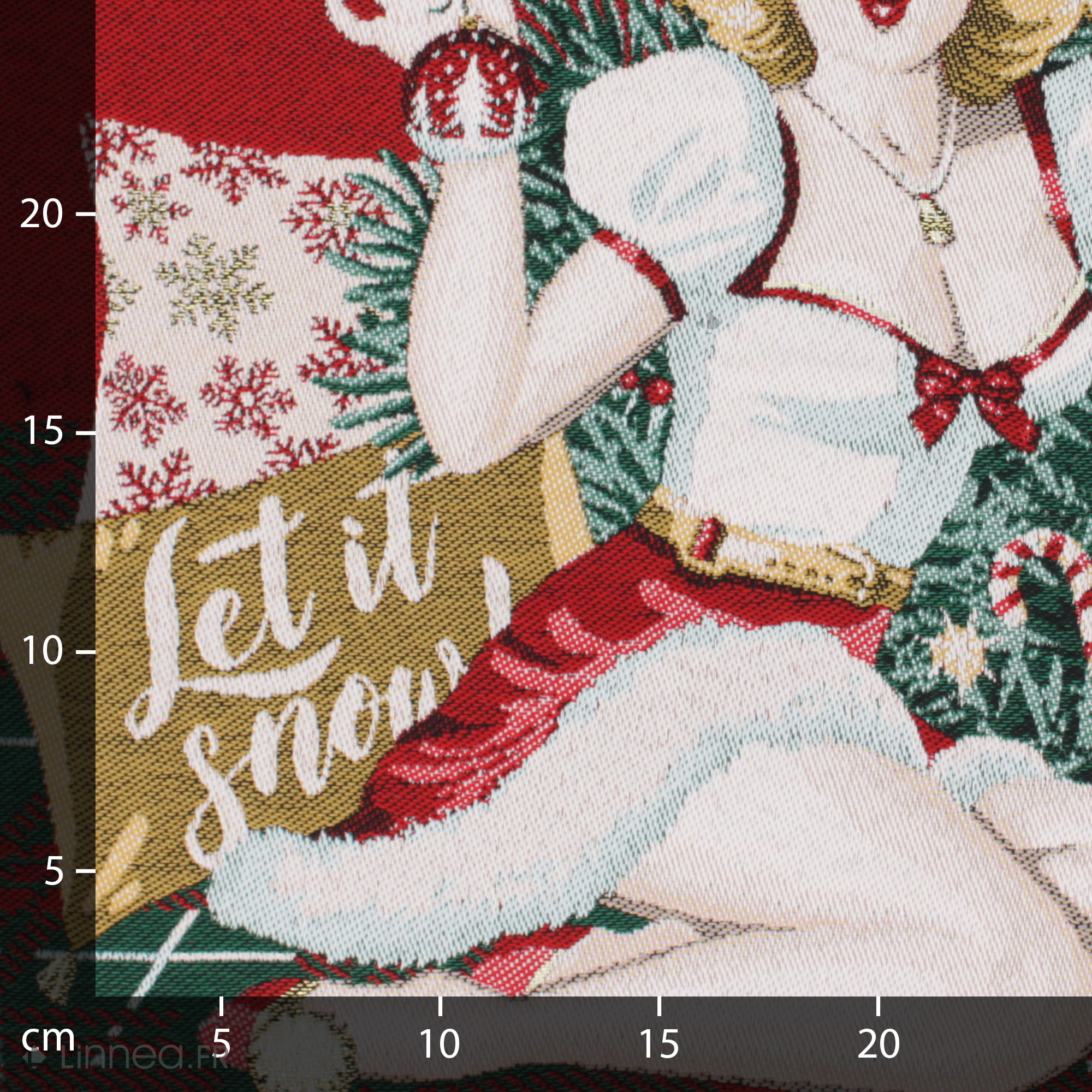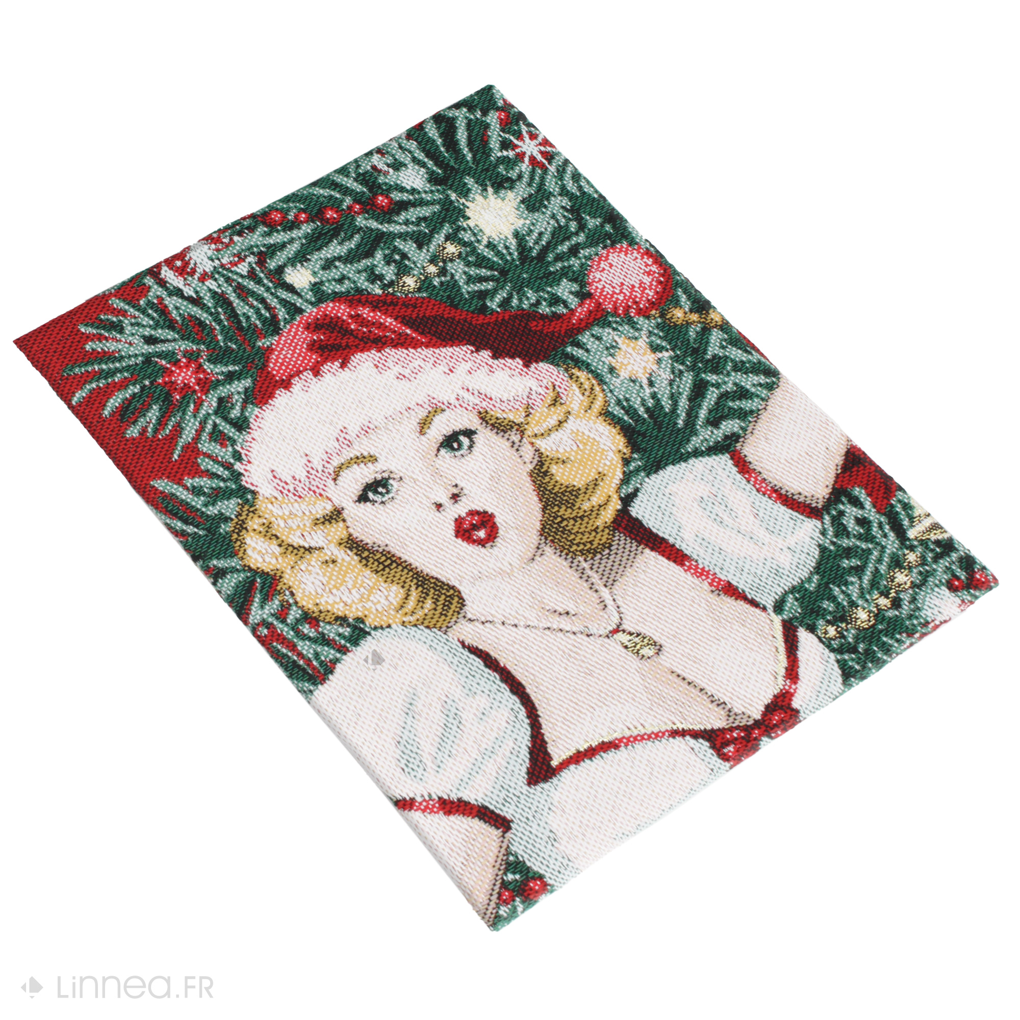 Tissu carré jacquard tissé teint avec un motif festif mettant en scène une mère noël décalé devant un sapin de noël sur fond dominante couleur rouge et vert.
