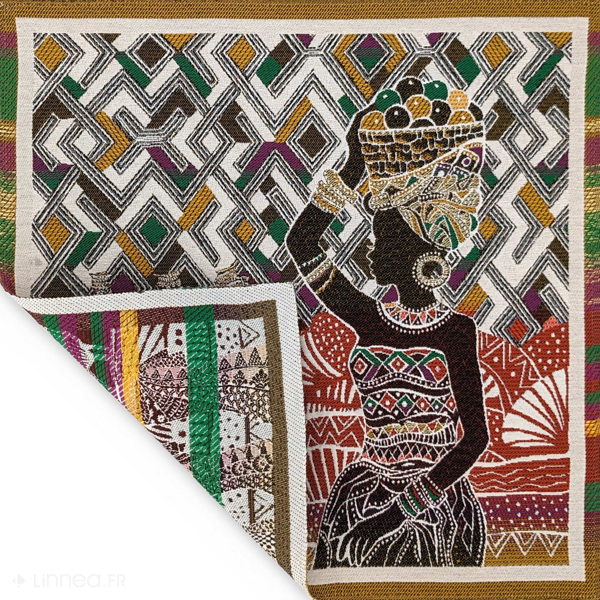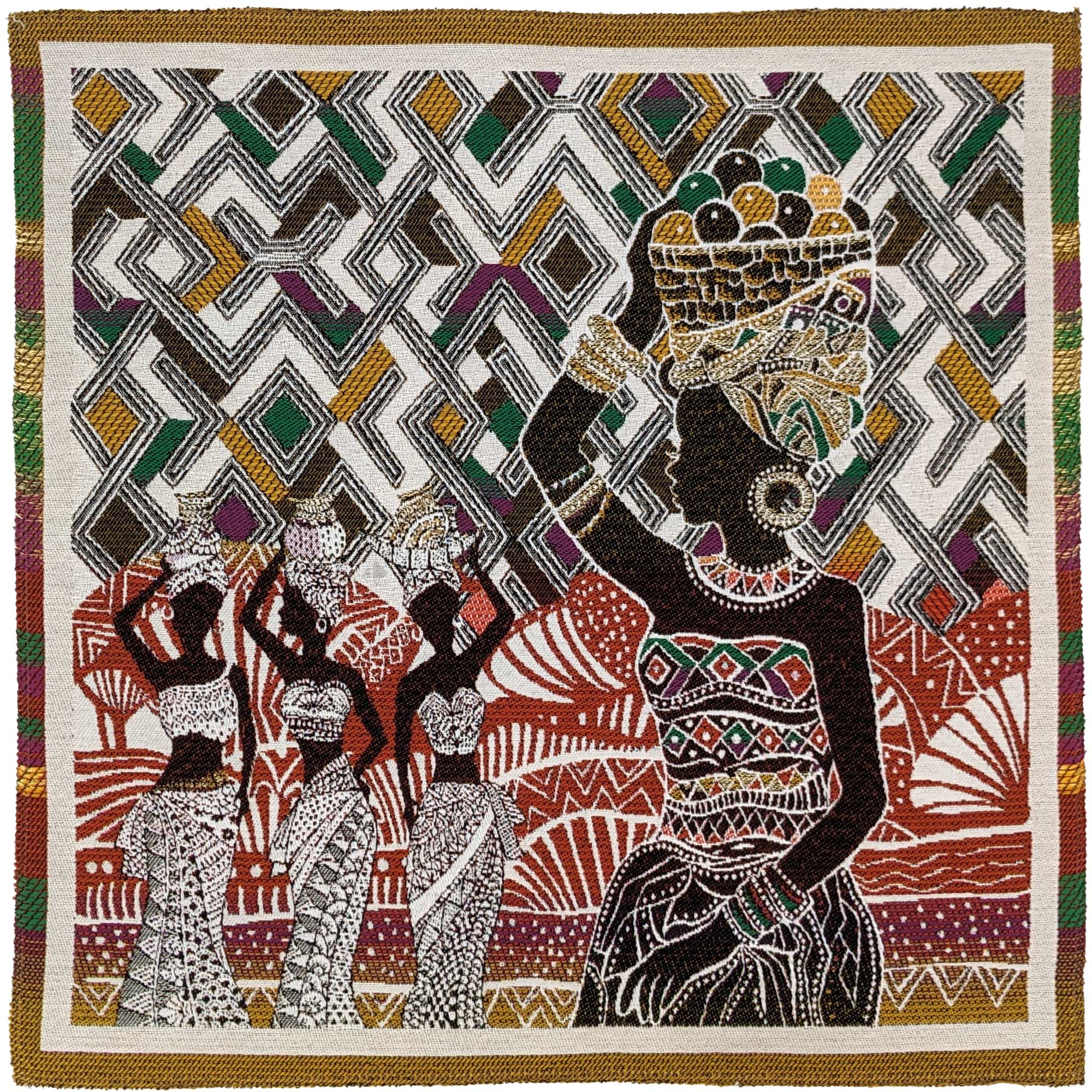 | Plus produit | Carré jacquard tissé teint motif africain en 78% polyester 22% coton 47x47 cm collection KUBA avec en motif des femmes portant des paniers sur leur tête avec en fond des motifs africains colorés. |