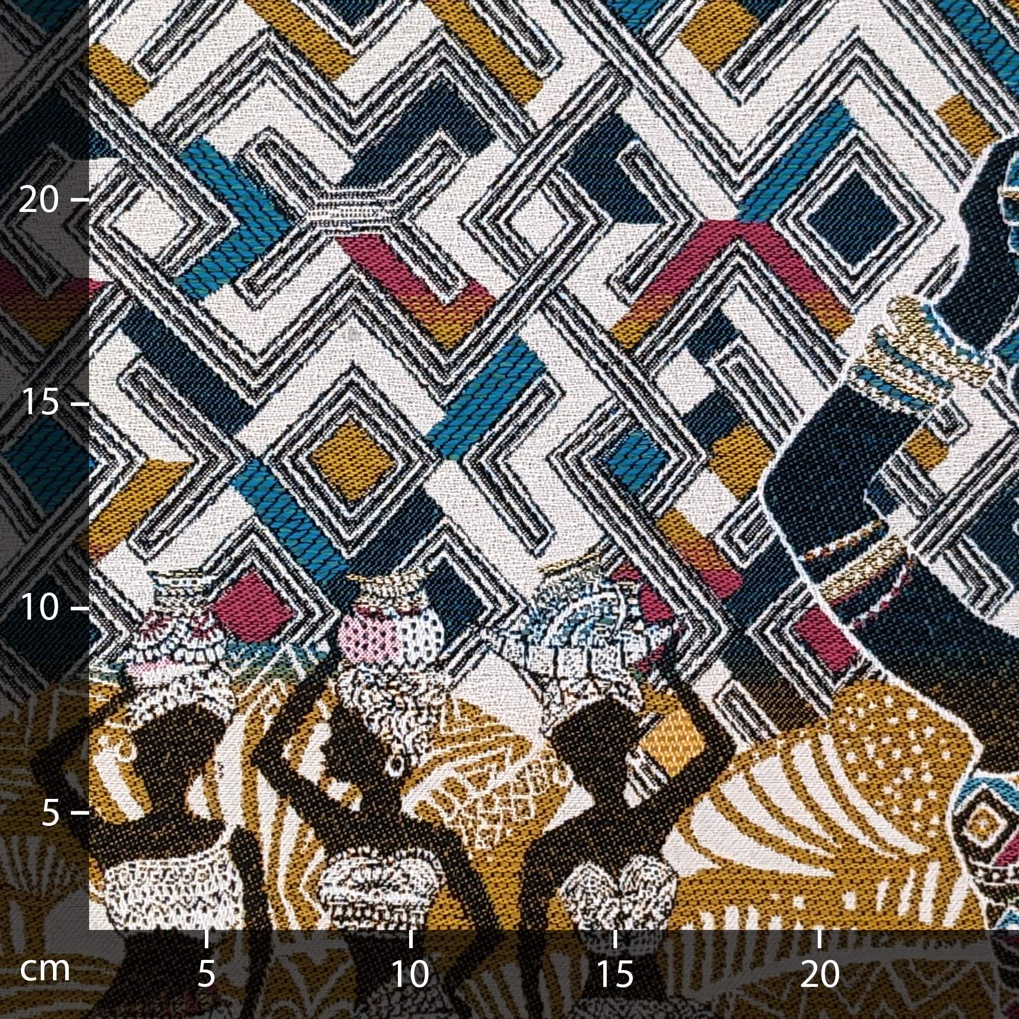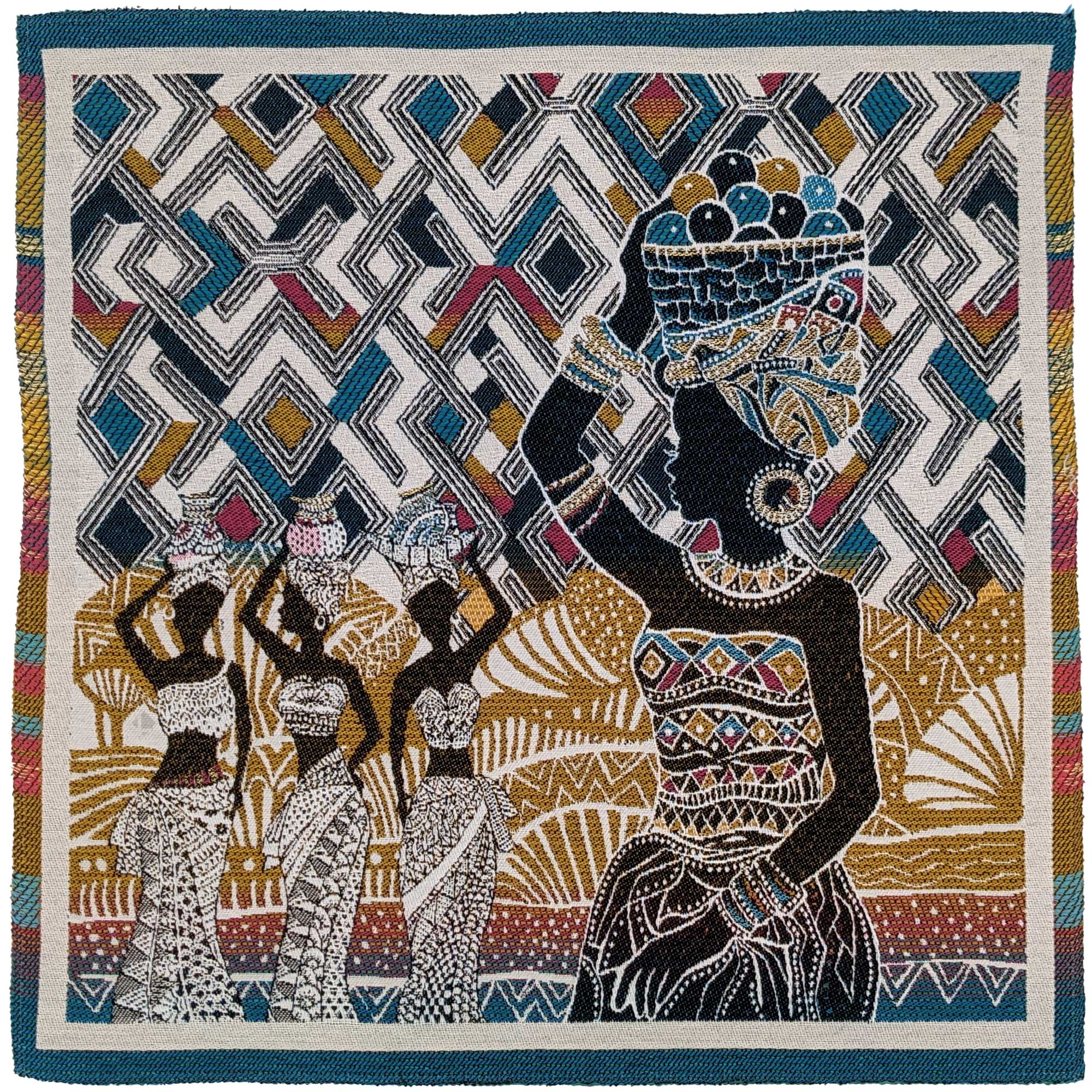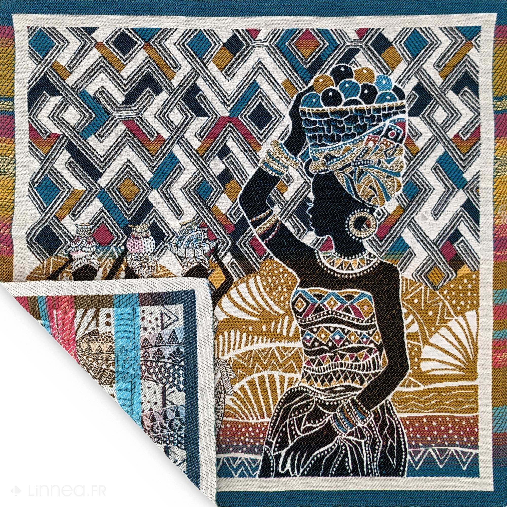 | Plus produit | Carré jacquard tissé teint motif africain en 78% polyester 22% coton 47x47 cm collection KUBA avec en motif des femmes portant des paniers sur leur tête avec en fond des motifs africains colorés. |