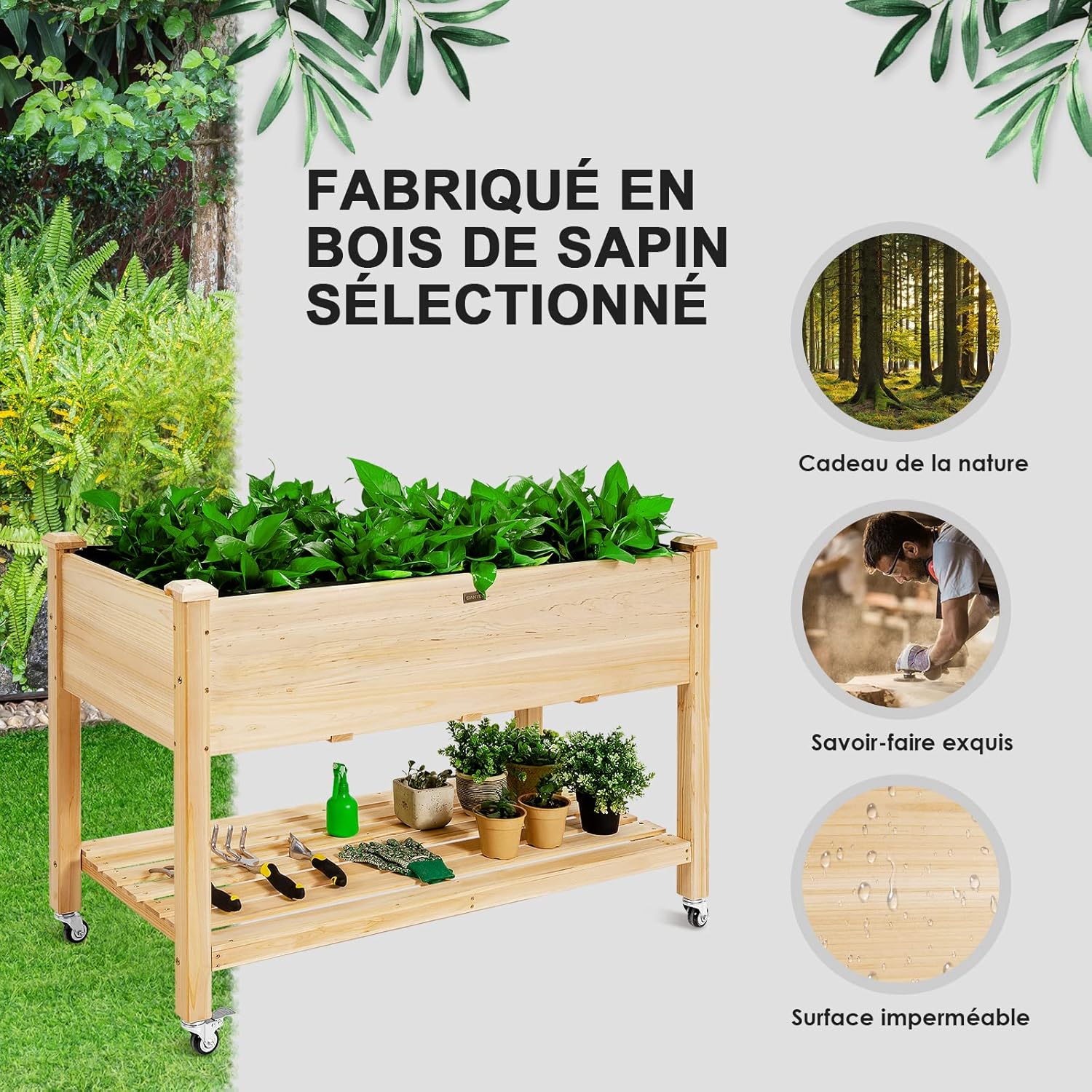 | Libellé | Carré Potager avec Roues Verrouillables, Jardinière Surélevée sur Pied en Bois avec Étagère de Rangement & Trou de Drainage |