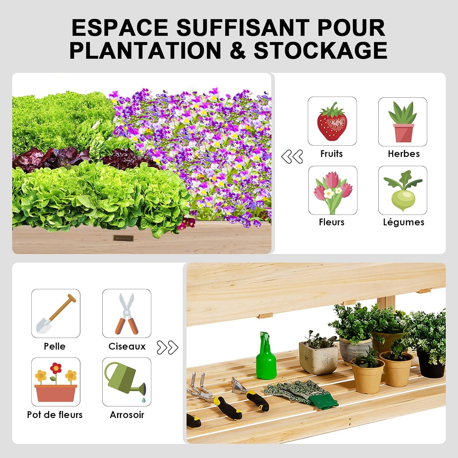 Jardinière polyvalente : Cette jardinière surélevée a 2 niveaux pour planter et ranger. Vous pouvez y planter des fleurs, des légumes ou des plantes dans votre cour, jardin et serre. L'étagère inférieure peut être utilisée pour ranger les outils ou accessoires de jardinage.