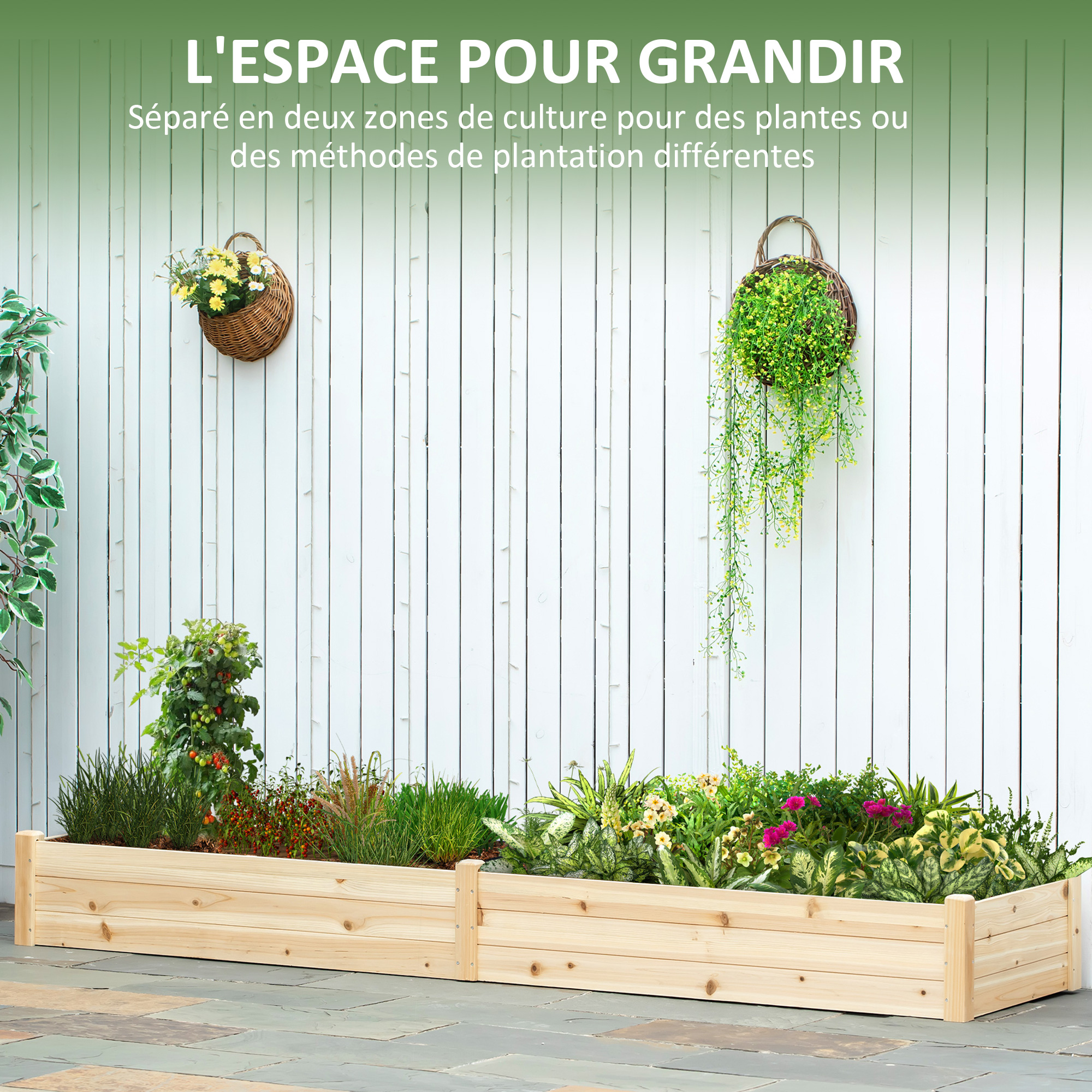 | Libellé | Carré potager de jardin dim. 244 x 61,5 x 27 cm feutre de drainage, séparation inclus bois de sapin |