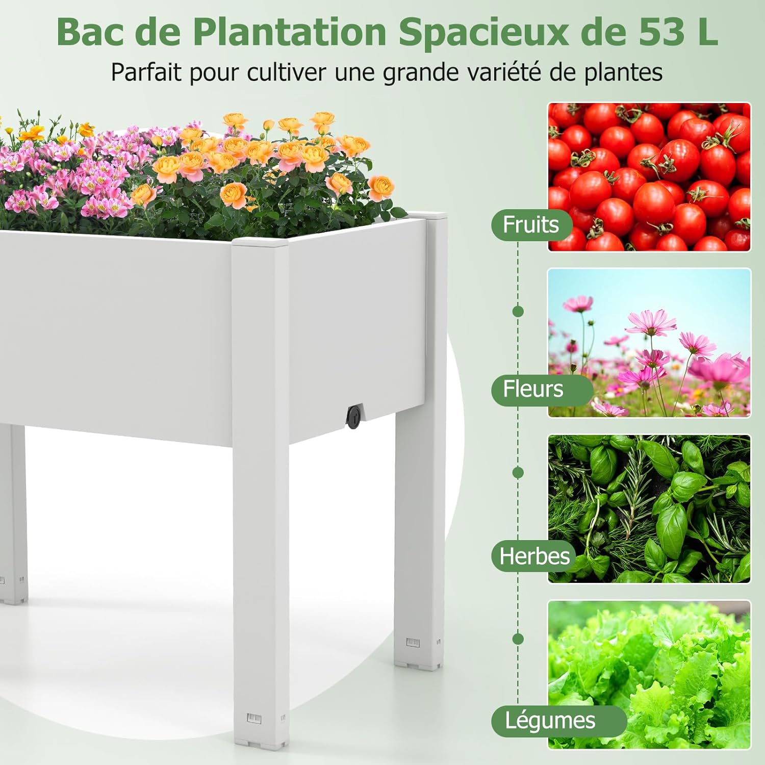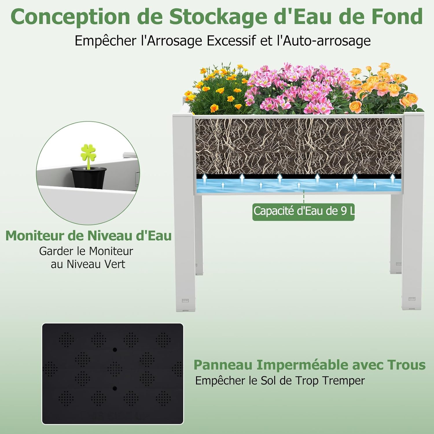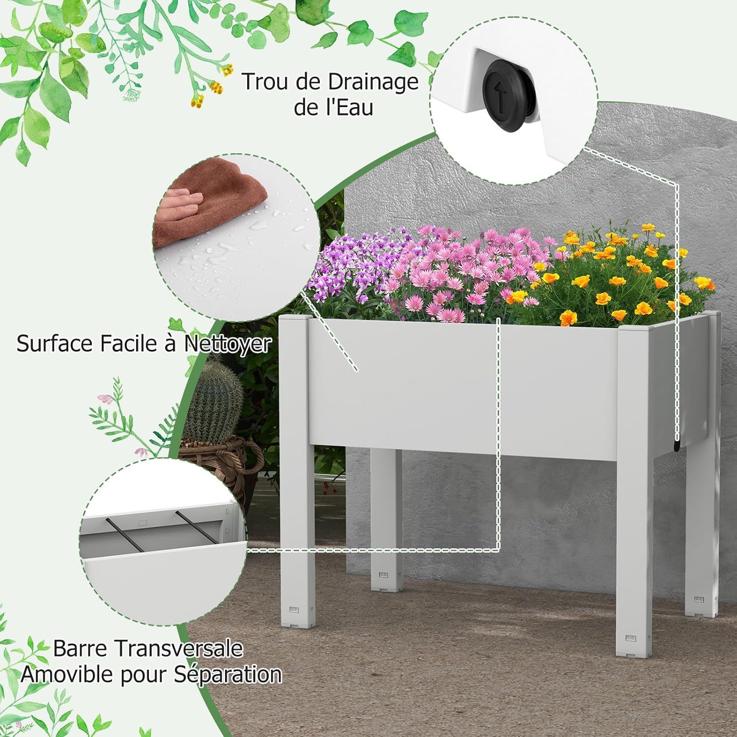 | Libellé | Carré potager sur pieds 53 l, système d'auto-arrosage, moniteur de niveau d'eau, trou de drainage, blanc |