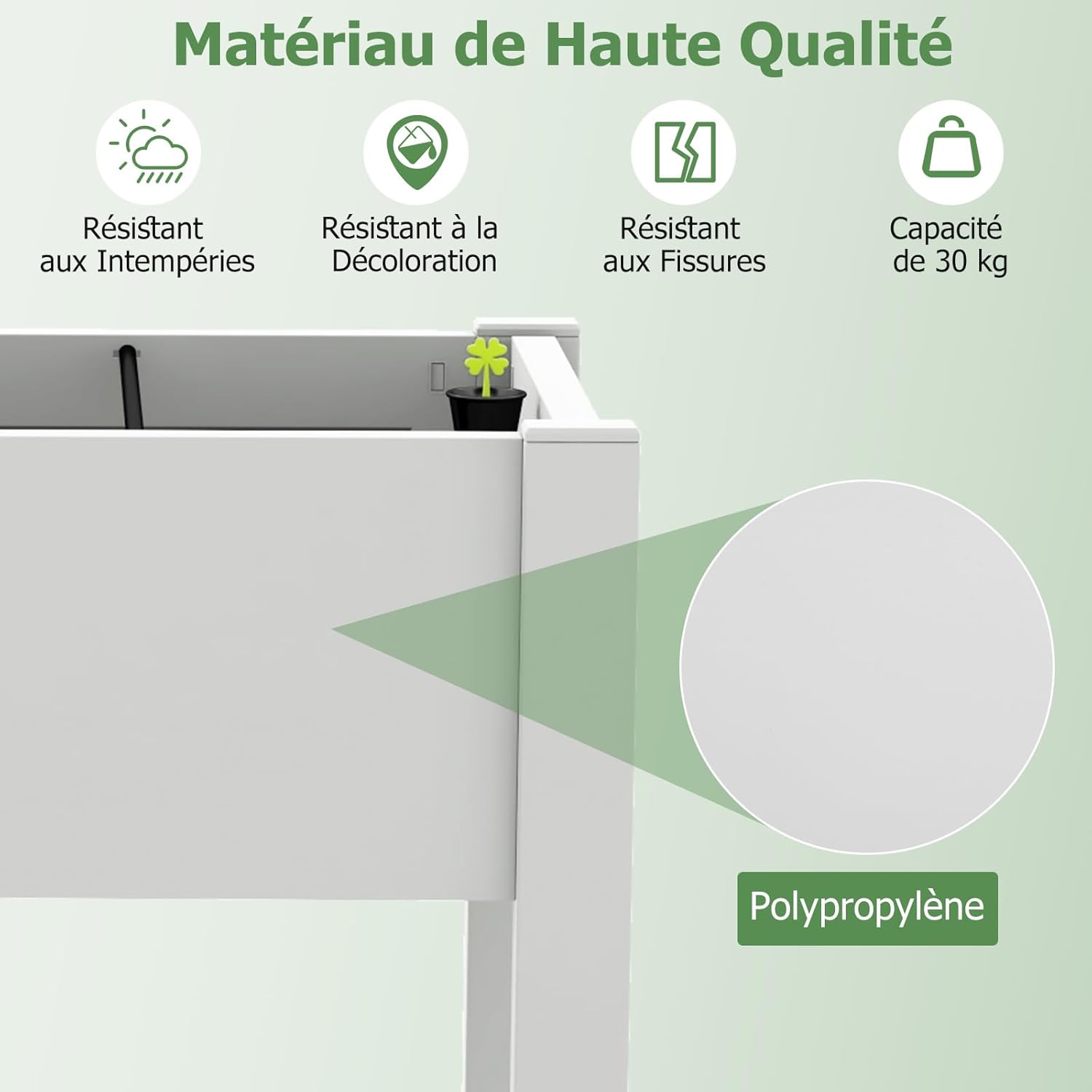 - Matériau de Haute Qualité : Fabriquée en matériau PP durable et de haute qualité, cette jardinière surélevée présente une grande résistance aux intempéries, à la décoloration et aux fissures pour une utilisation à long terme en extérieur.